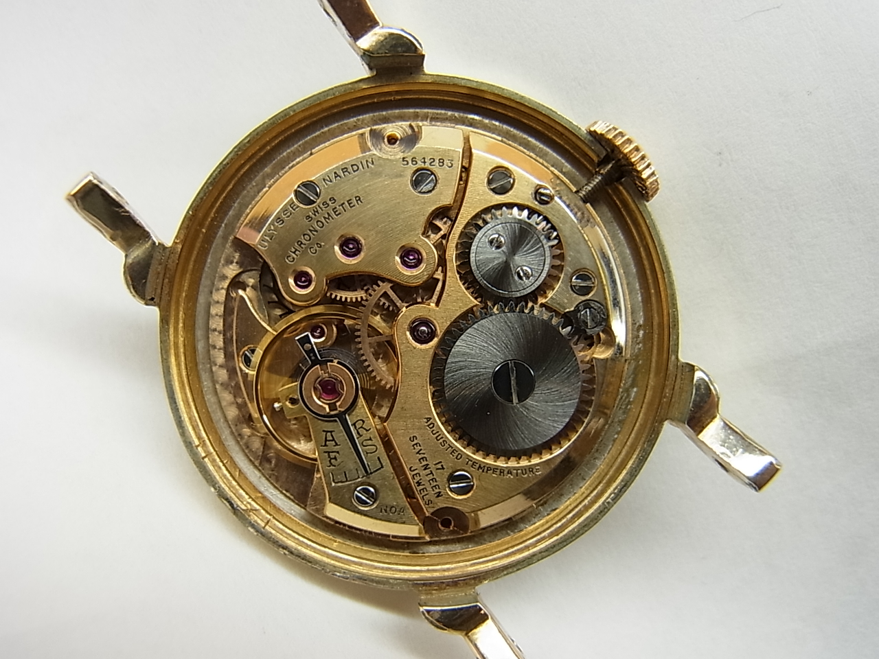 *純正刻印の入ったGFケースに綺麗に仕上げられた11型のクロノメーター機械(前回のメンテナンス歴は不明ですが姿勢差をふくめまあまあの精度がでています)…..そして文字板だけは?です。プリント部分の出来具合があまりに「リダン?」って感じなのですが、当時の輸入品のなかには明らかに純正と判断できる品でもこの程度の仕上がり品も確認していますので……とりあえずリダンと思っておいて下さい。