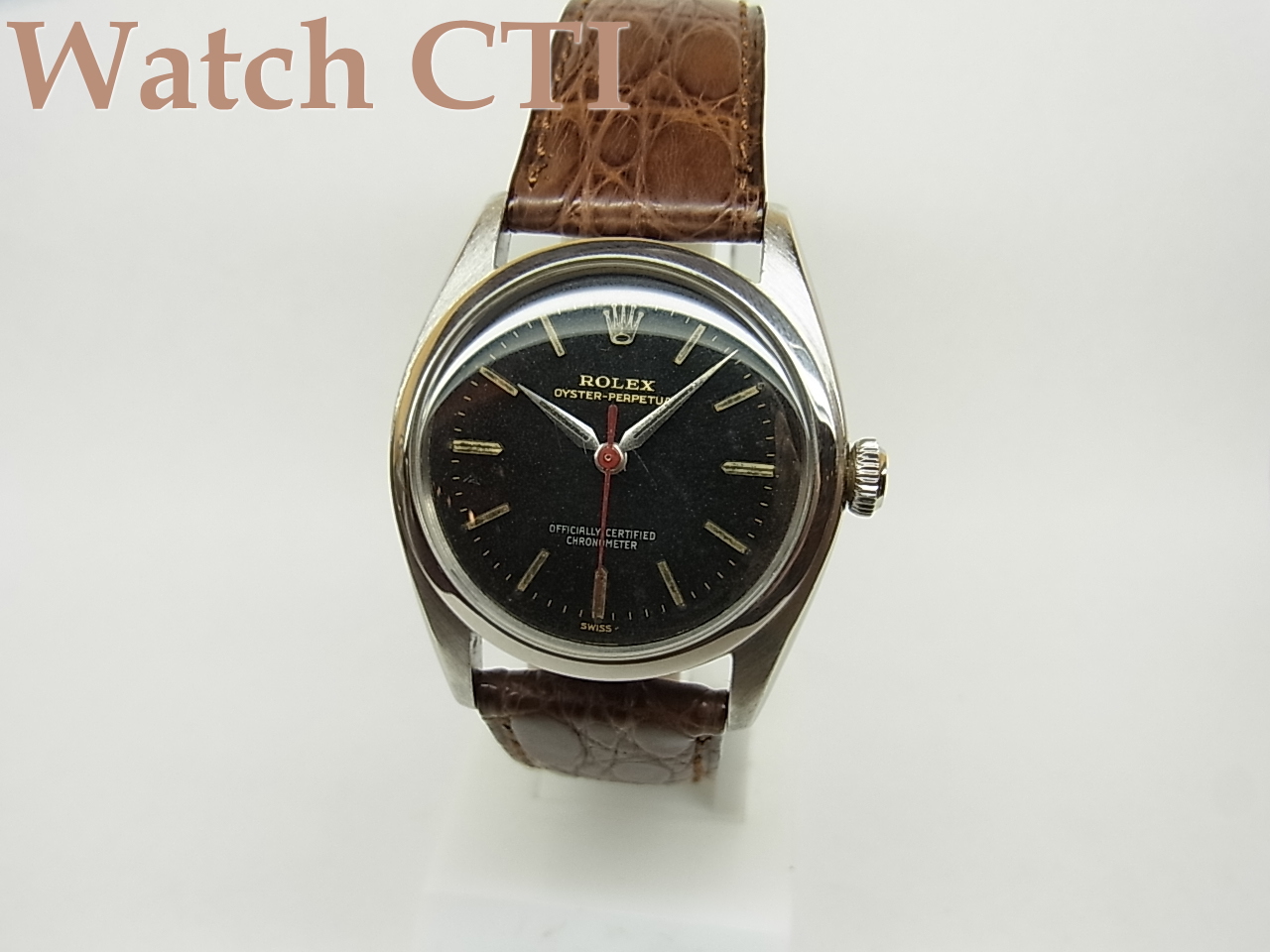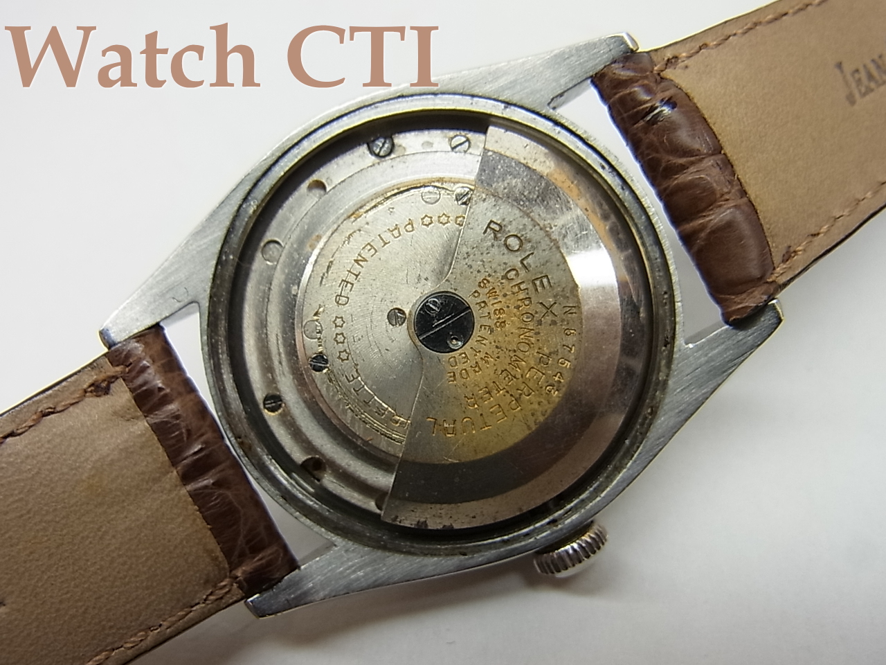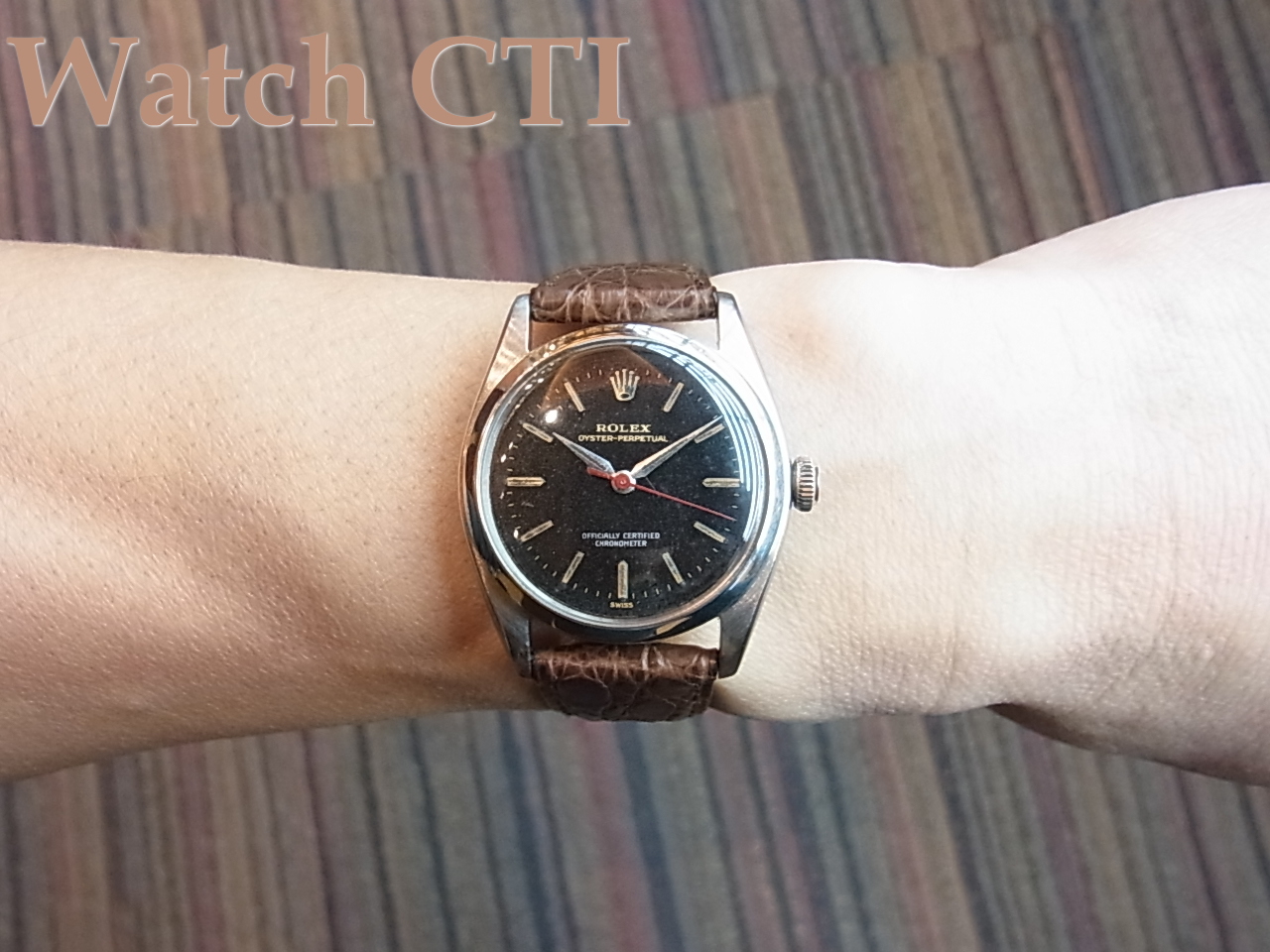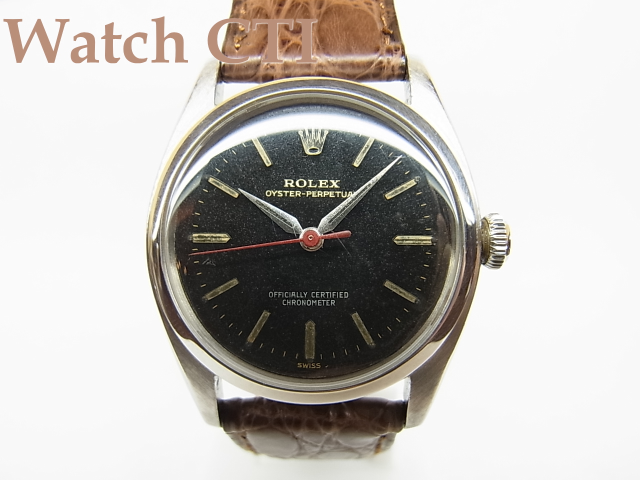 もともとはグロス(所謂ミラー)ダイヤルでしたが、全体に90%近くグロスは失われており、い良い感じの経年変化をしております。もちろんギルト仕上げのレター類は真鍮カラーの薄いシャンパン色ですね。そして50年代のその他モデルでたまに見かけますが、クロノメーター表記がマットシルバーのプリントで入っております。さらに、セコンドはレッド!!!