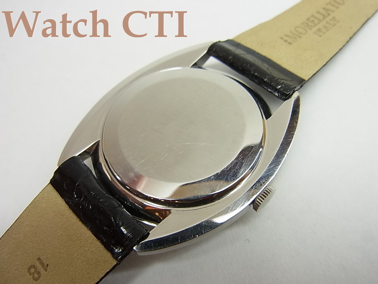 現品のケースデザインは典型的な70年のイメージですが今の目で見ても形状の美しさや仕上げの丁寧さは明らかで、70年代のインターの「代表作と言っても良いと思います。文字板デザインに各種ありますが、このホワイトフェイスにブレゲプリント。そして黒塗りのリーフ針という組み合わせは、70年代からしても「レトロ」であったはずです。非常にあの時代的ですね!!