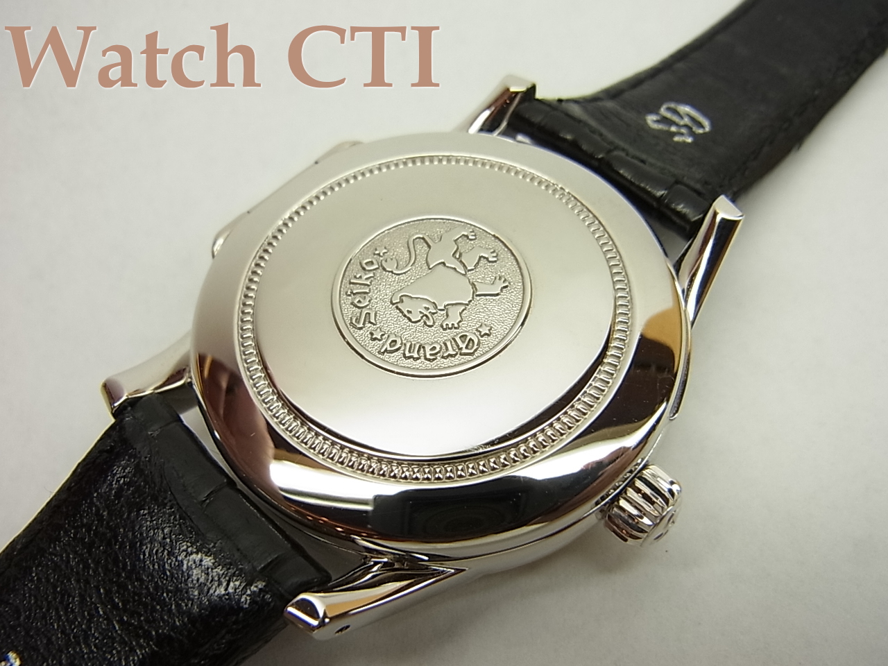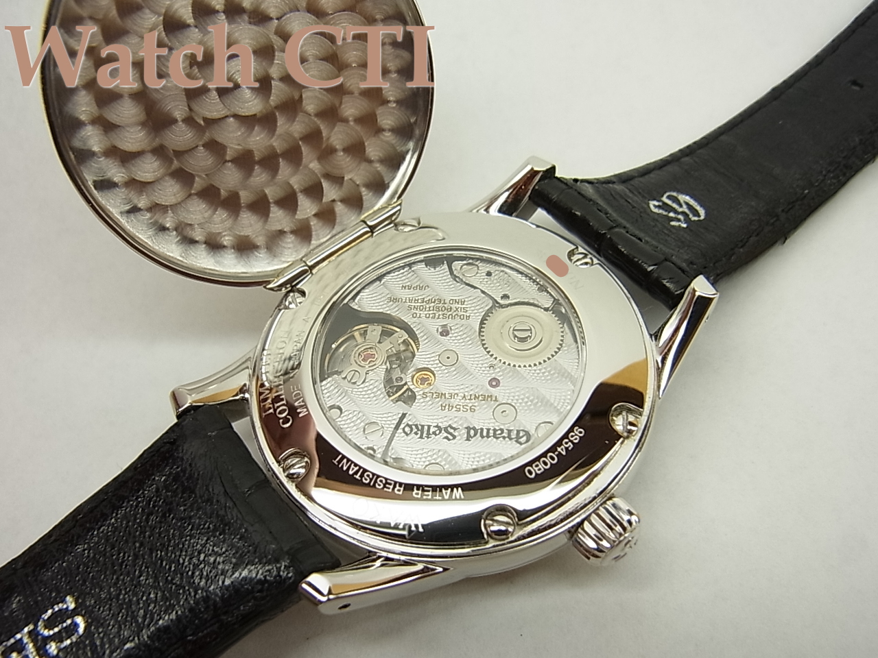 ケースバックはハンター式(ヒンジ式)の外蓋が開閉可能で、その内側はサファイアクリスタルを透して盛岡・雫石工場の「神の手」大平 晃氏が組上げた、特別彫金の施された手巻ムーブメント9S54Aを観ることができます。付属する歩度証明書は2006年3月に発行されております。