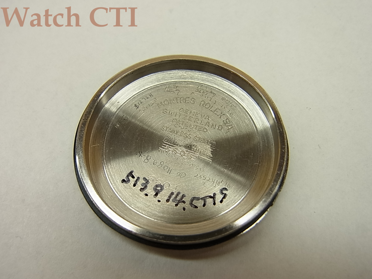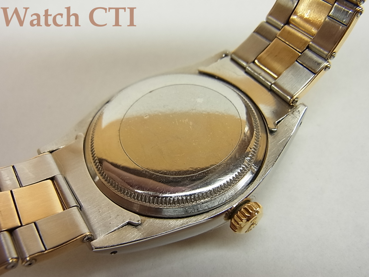 ◆ケースは軽いポリッシュが入っていますが、純正形状を良く保っております。ケースバックの蓋あけに難儀した時計職人が「ギザ」の個所に対角線に通常工具が掛るように溝を加工してしまった跡はご愛敬です…..40-50年代のオイスターケースは世界的には発売当時からしばらくは蓋あけ用の特殊駒がまだまだ普及していなかったために、このような「強硬策」を施されたものがしばしば出てきます….。