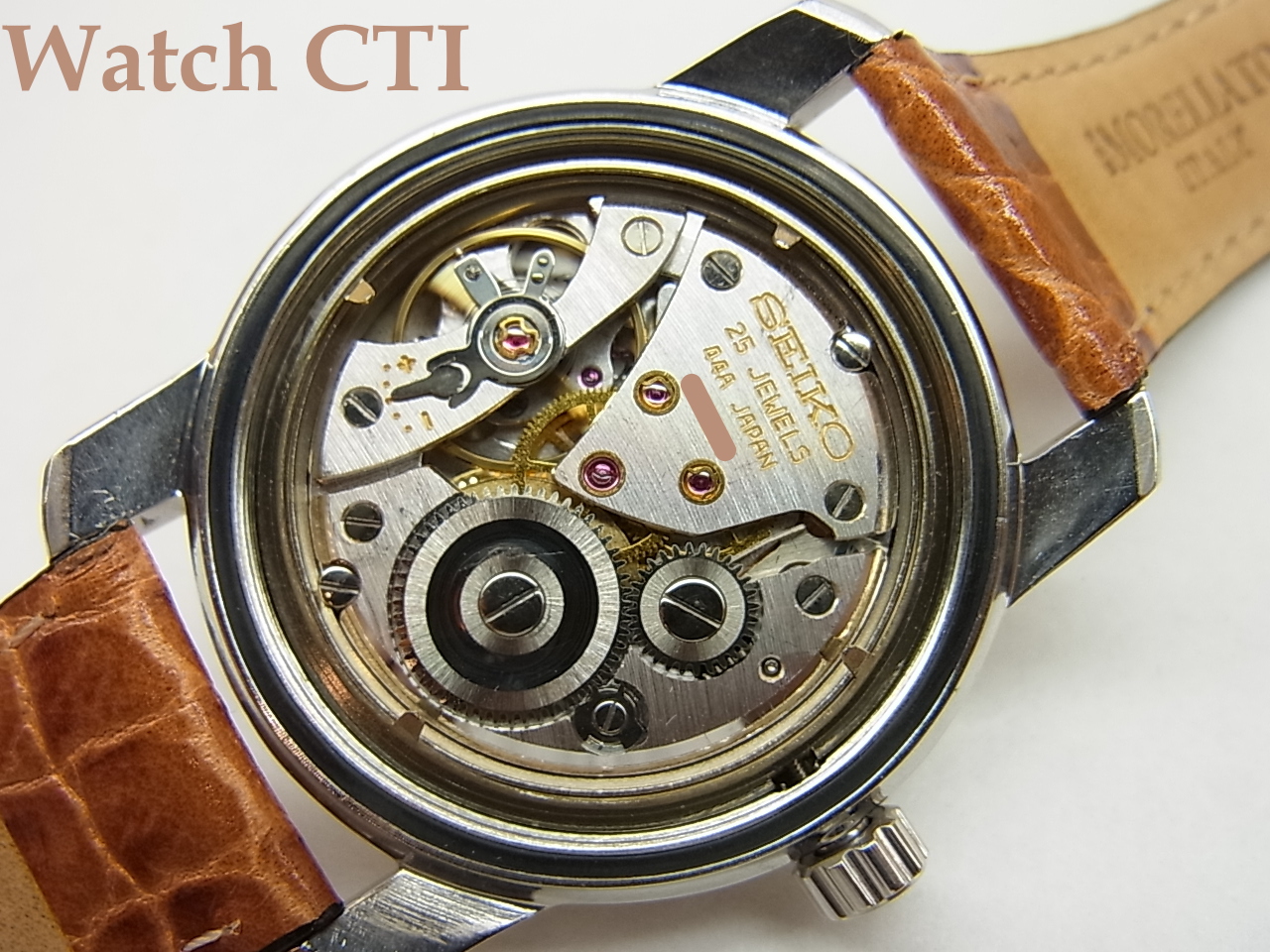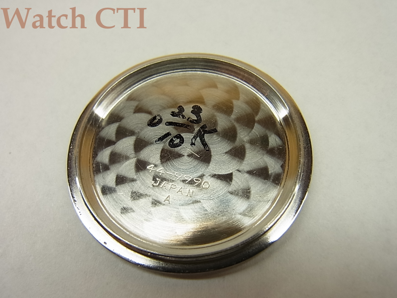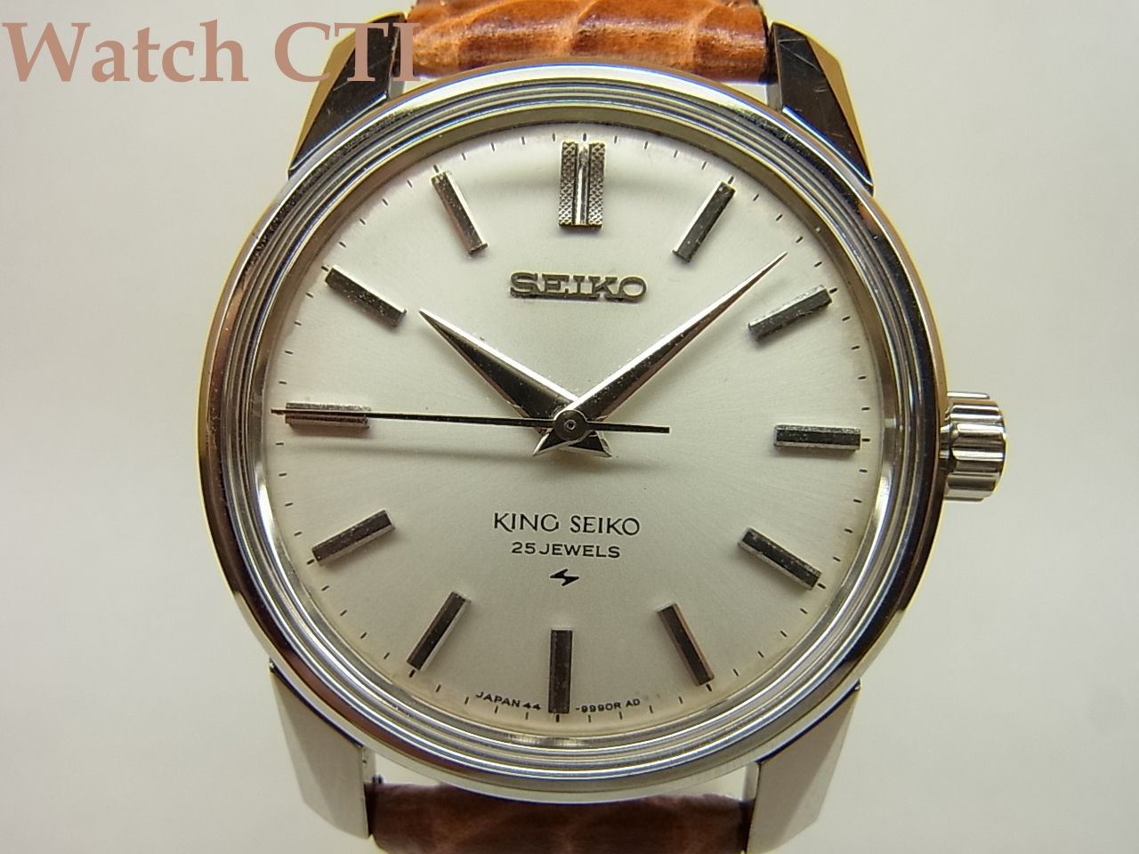 *現品は3種類でたセカンドモデルのうちの一本で、初代KSのベースムーブである11型5振動ロービートのクロノスをさらにリファインし秒針規制を搭載した44Aムーブを搭載しました。さらに、初代では外装はスナップバックのみでしたが、スクリューバックを採用してちょっとした防水は保てるようになったモデルです。かなり実用を意識しており現在でも十分日常使用いただけます。しかもロービートムーブメントを搭載しており、カレンダーも付いていませんのでシンプルこの上なし!カレンダー付きが必要な方にには別途カレンダー付きのCal.4402をスクリューバックケースに搭載したモデルも用意して対応しておりました!因みに初代同様のスナップバックモデルも出してキングセイコーはセカンドモデルとなり、3種類のヴァリエーションで市場の要求にこたえようとしていたことが解ります。