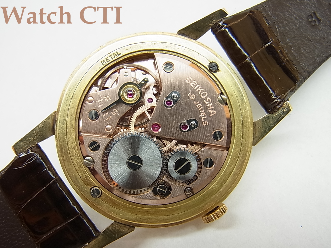 レギュラーモデルは17石ですが、金ムクは19石の「赤キカイ」です。文字板も凝った意匠のものが採用されておりますが、19石のモデルは金張りケースなどでもやはり凝った文字板が多いようです。やはり17石との差別化を図ったものでしょう。