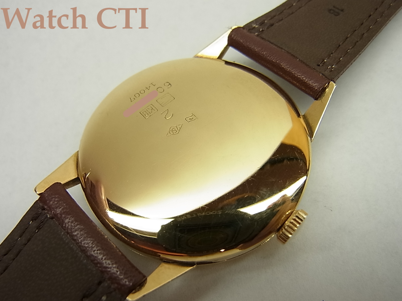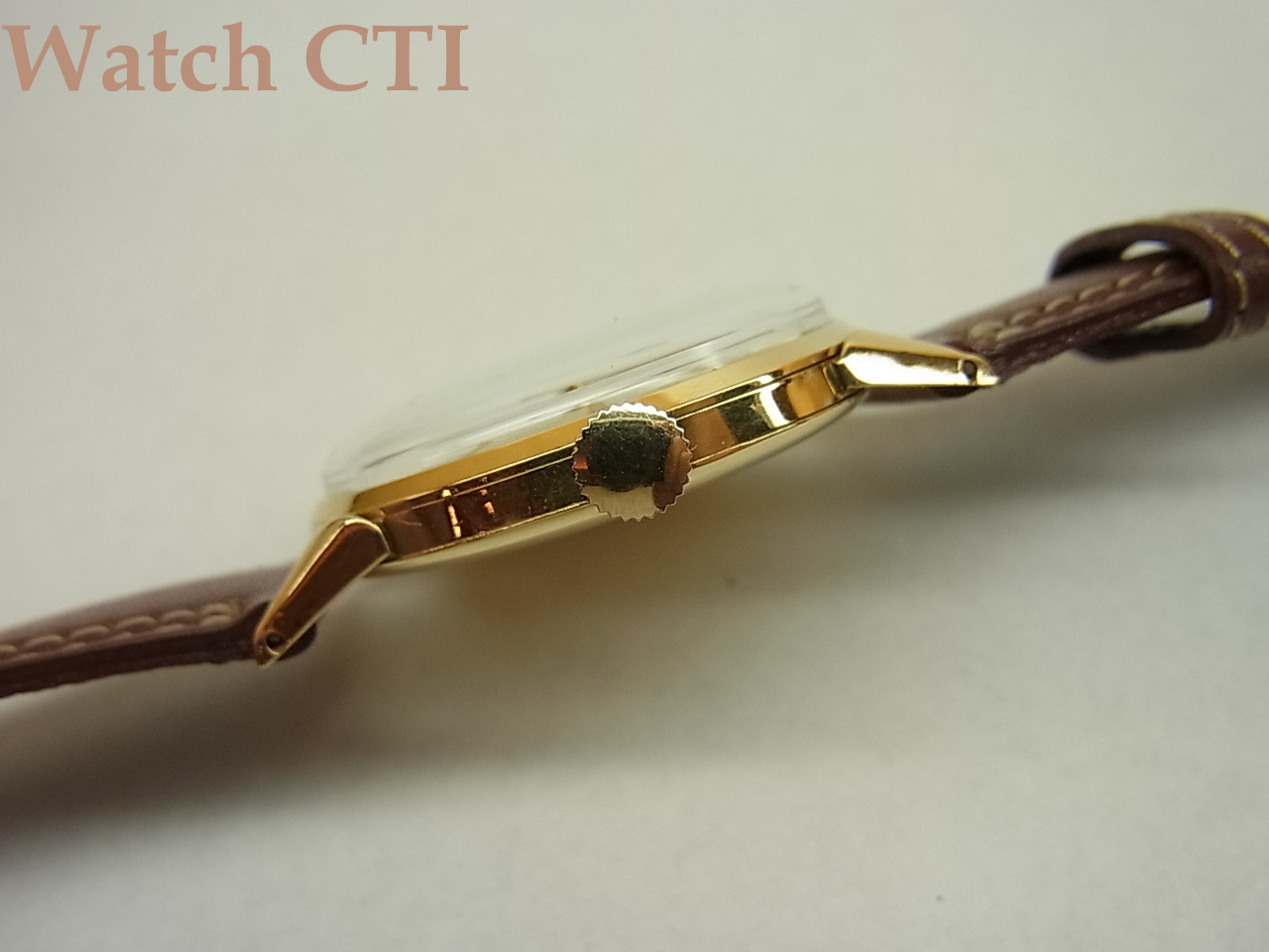 *昭和25年の発売当初は8石又は10石の機械を外形の小さな約27mmほどのケースに入れて販売されていましたが、あっという間に復興していく経済とともにケースサイズは「大型」なものが嗜好されるようになって行きました。現品はそんなスーパーの最終デルで、昭和29年に追加された17石の・耐震装置(E-1型)付きの「赤キカイ」仕様であり、そして何より18金ムクの”大型”33ミリケースに搭載されて世に問われた豪華な一本です。昭和31年と言うと同年6月にはスーパーの後継機「マーベル」が11型の機械を搭載して発売されており、行ってみればこの現品はスーパーの「最終限定仕様」的な成り立ちの商品であったのではないかと思います。