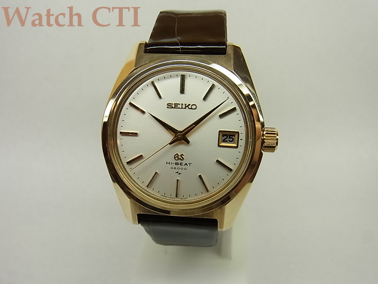*文字板は良く見られる太めのインデックスではありません。ひょっとすると45GSの金無垢用のものかも知れませんが、詳細は不明です。状態はインデックスに自然な経年変化の曇りがある程度で、長短針とともに全体に美しく保たれておりますよ!