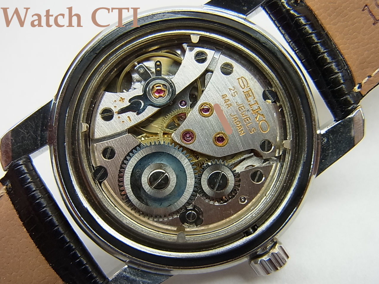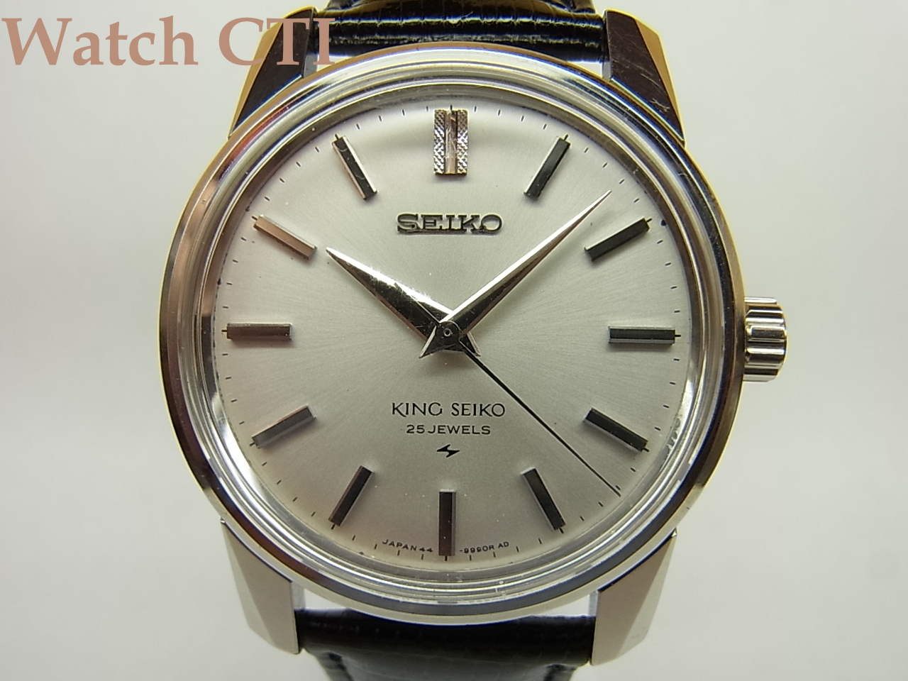 ☆数あるキングセイコーの中でも、私見ではありますが、この44-9990ケースが一番迫力のあるものだと思います。何といってもラグの形状が力感に溢れていると思いませんか?そしてカレンダーの付かない文字板にこれまたごつい感じのバーインデックス!で、極めつけはそのインデックス中の12時の形状をご覧ください……どうでしょうか?この表面の加工。