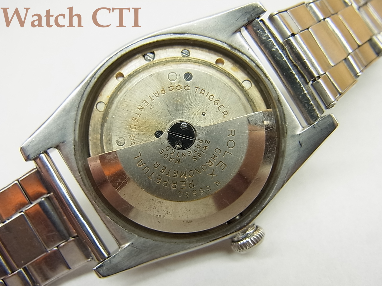 *長短針についてですが、長針先端がほんの僅かに外周のミニッツトラックに届いておらずまた先端の三角部分が下方向へスラントしていないため、40年代当時のメルセデス針でないかもしれません。しかし、ブルースチール部分の表面は明らかに長年の経年変化がでており、また短針の夜光も古いものです。(長針の夜光は後年の入れなおしと判断できます。)20年ほど前に出回っていたレプリカのメルセデス針とも造りが異なりますので、ロレック社の後年の交換用針かもしれませんが、詳細は不明とさせてください。
