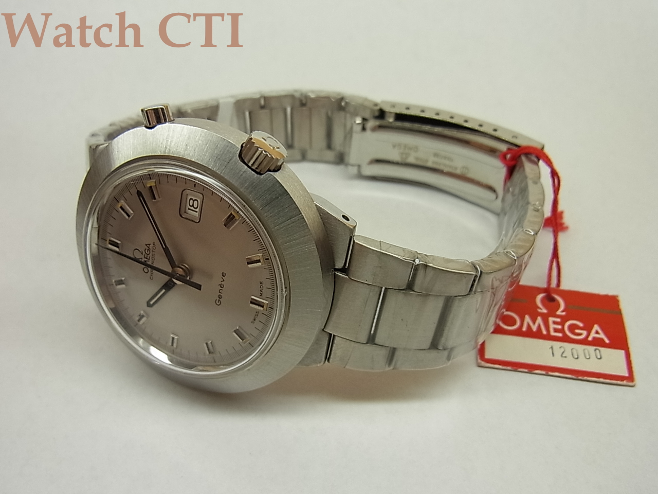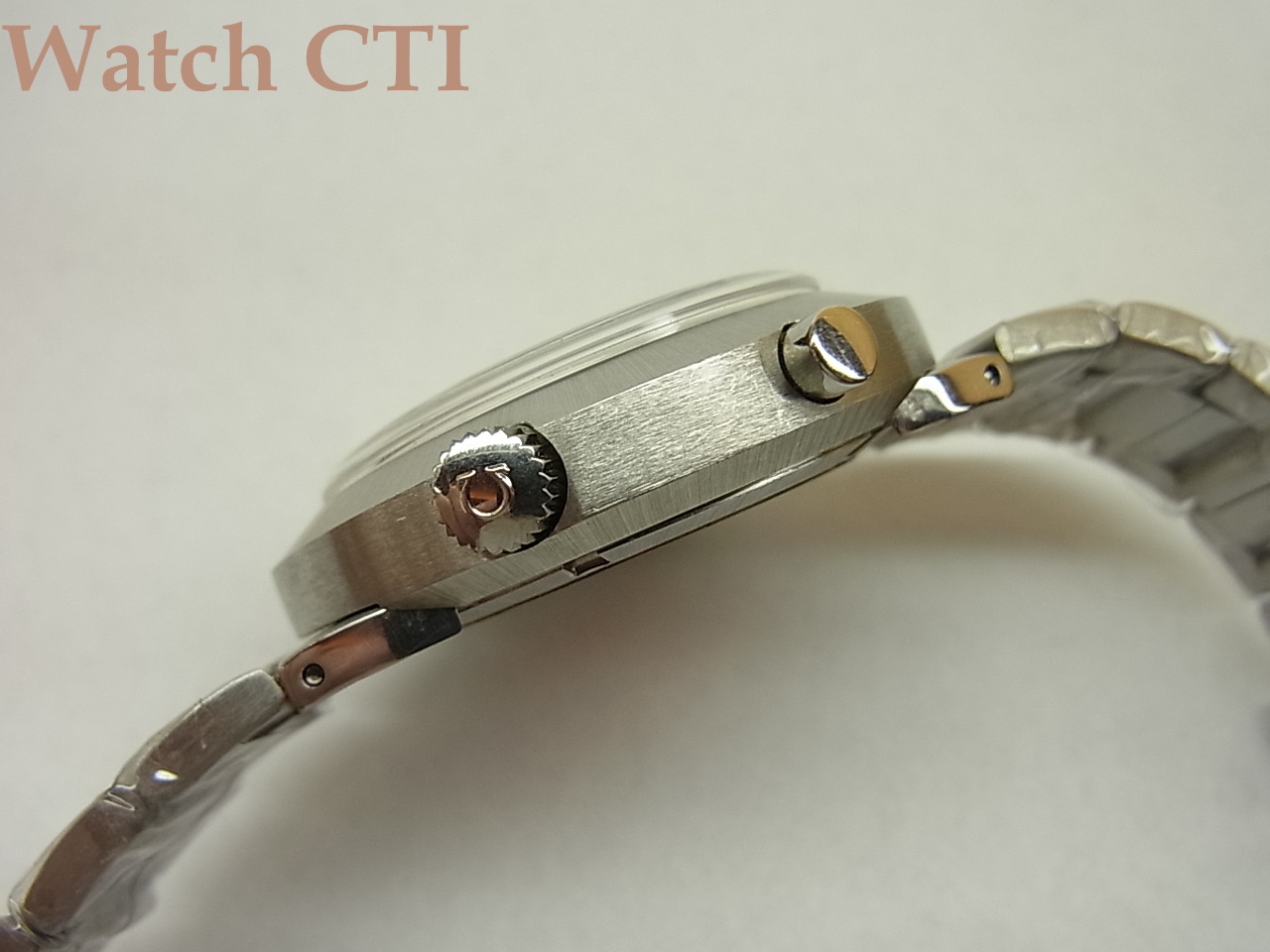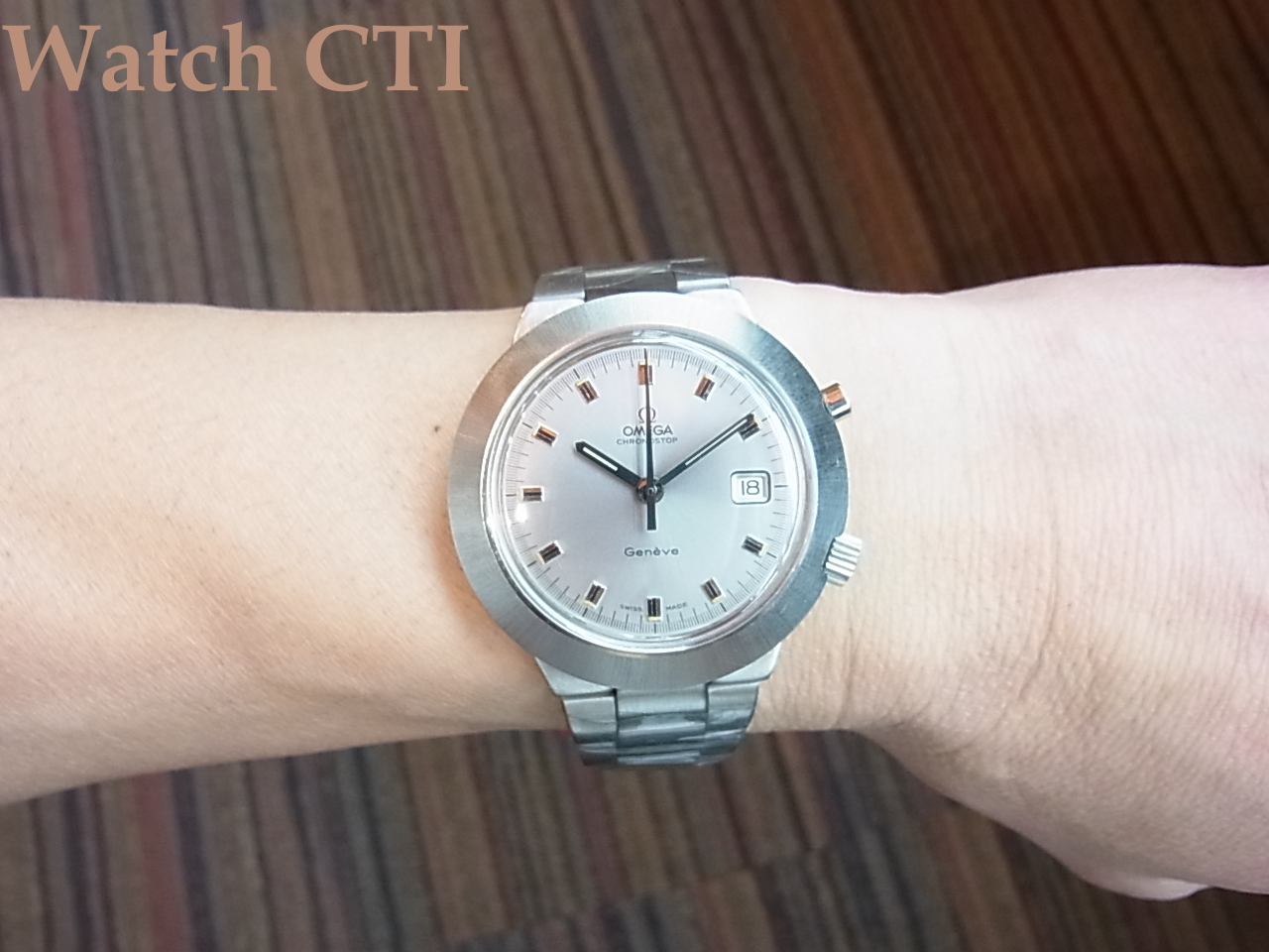 ケースバックシールににオリンピックマークが入り、その外周にモデル名として「クロノストップ・ペンタトロン」と入っておりますね!シンプルな表情ですが、大きさもそれなりにあり、今見ると良い感じです!