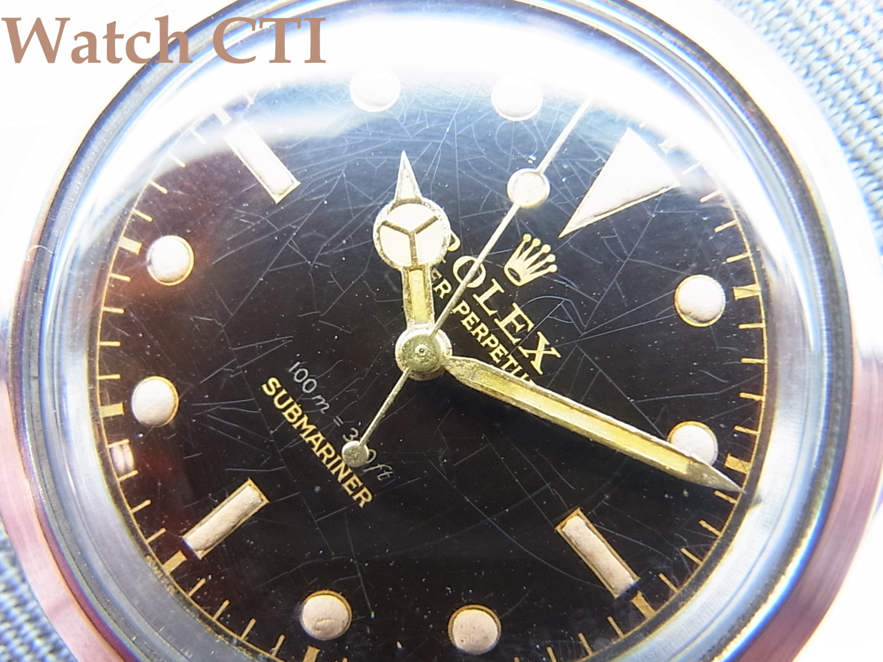 残念ながら回転ベゼルが欠品しており、代用の別途作成したスムースベゼルが取り付けられております。惜しいです….。リューズは当時のままの「+」プラスマーク付きリューズが付いておりますしダイアルもスパイダー様になっておりますが純正のままのギルト(ミラー)ですね!