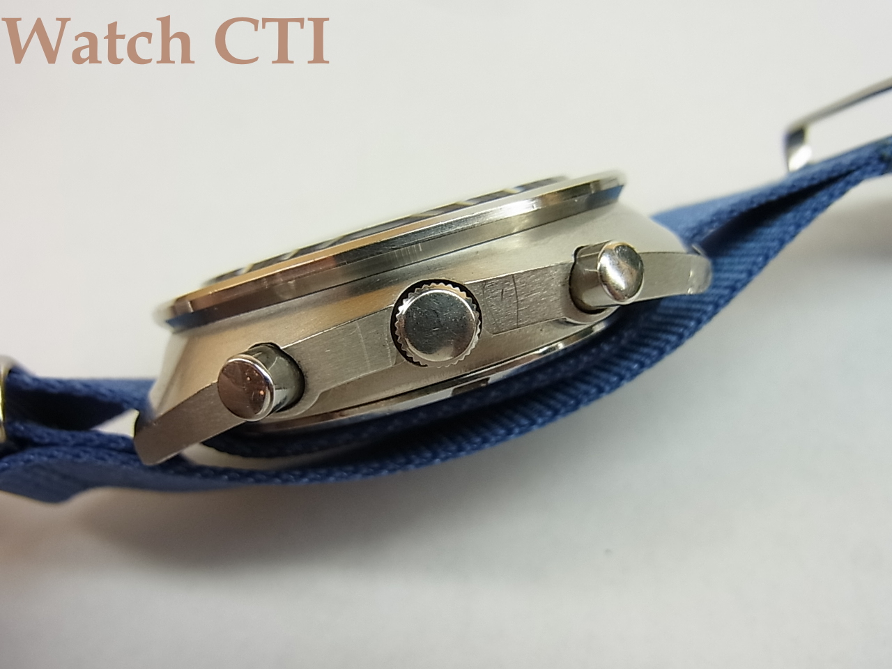 本来純正ではステンレススチールのブレスが装着されていますが、重たいヘッドが災いしてかかなりの確率で壊れしまい欠品しているものが多いのです…..。現品にはNATOベルトを付けてみました…..ら、おお中々のマッチングではないでしょうか?楽しめる一本ですね!