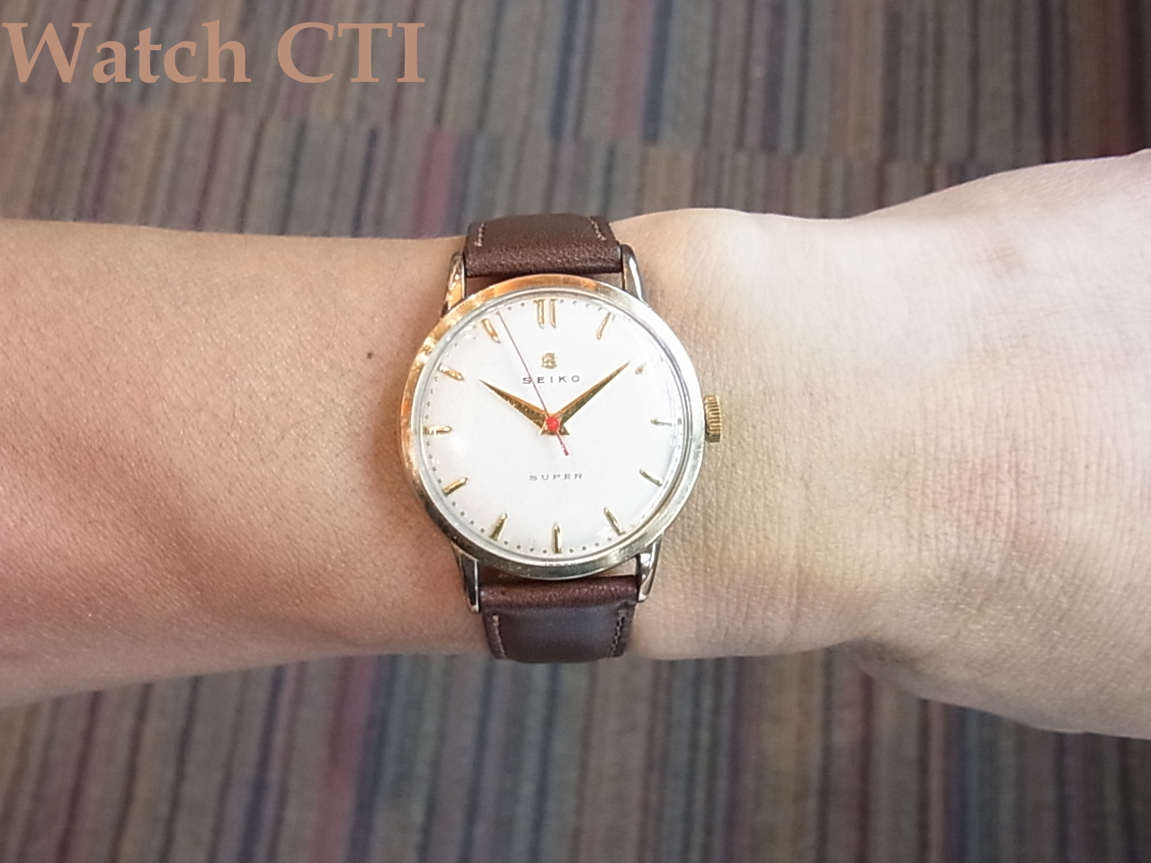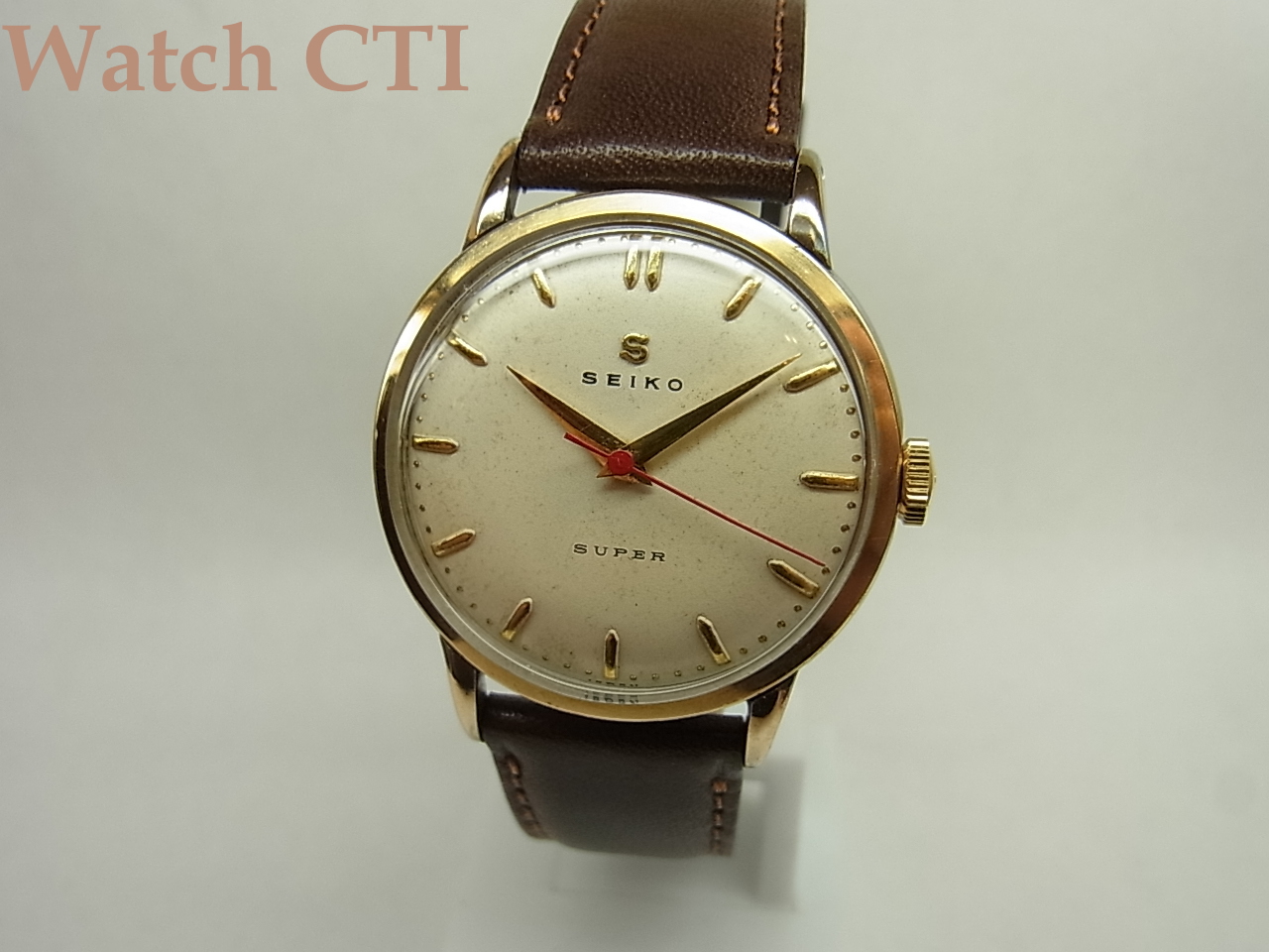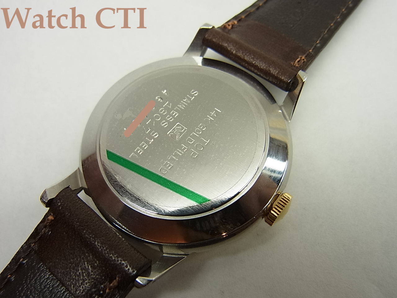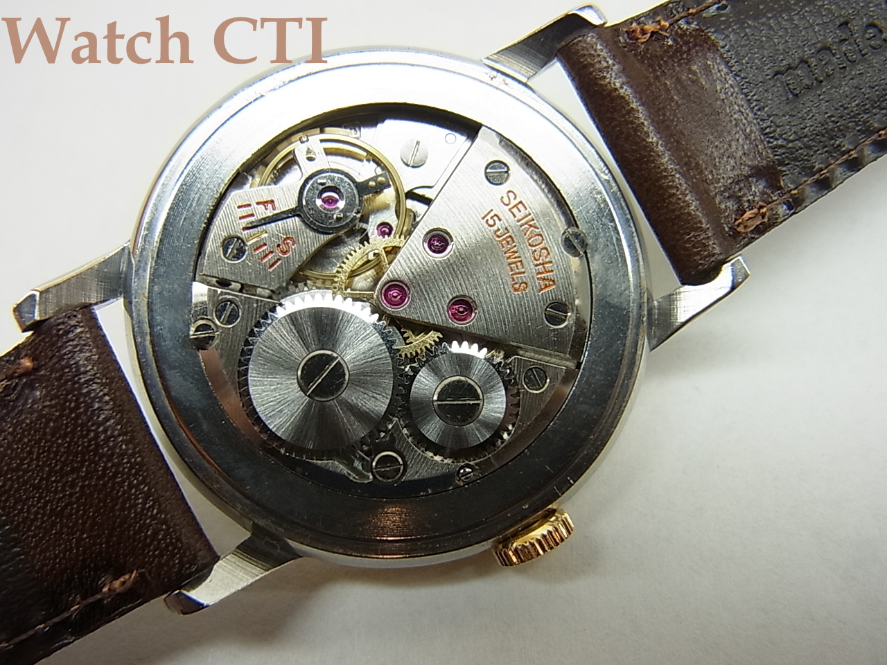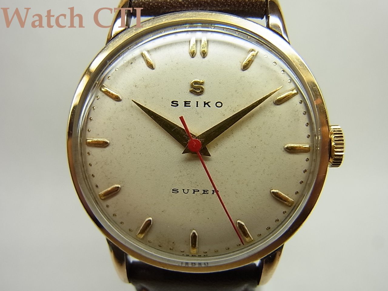 一般的にトップゴールドと云うと、ケースミドル全てが金無垢か金張りっていう仕様がほとんどで、現品のようにケースミドルのサイドがステンむき出し仕様は大変少ない….まぁエコ仕様なトップゴールと云うことにして置きましょう…..実際のところ昭和30年入るくらいまでの国産品ではそれなりに生産されたようです、舶来品でも以前IWC等でも見たことはありますがやはり少数派ですね…..。
