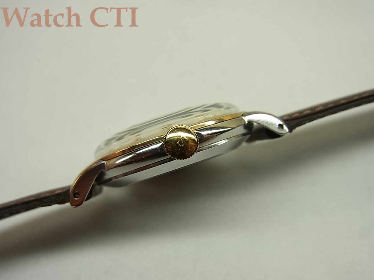現品ですが、ほんとその通り。時計を真正面から見るとゴールドにしか見えません….ベゼルもケースミドルもケースラグもリューズも全てゴールド(金色)。ですが、ケースをちょっと横にして見ると、なんとケースミドルのサイドはステンレス地のままです。このケースは本来の意味で「上側のみ金色」なのです!!