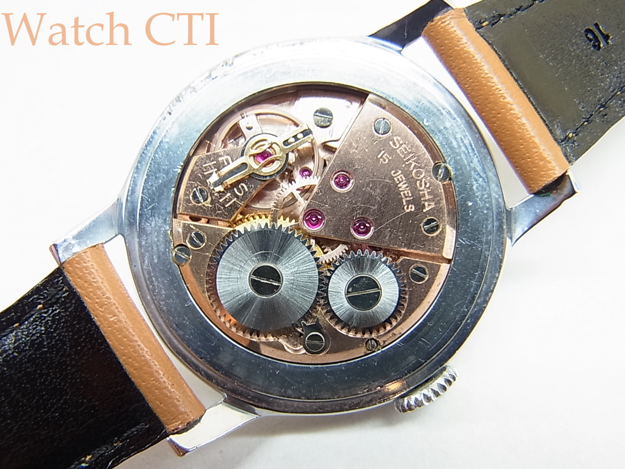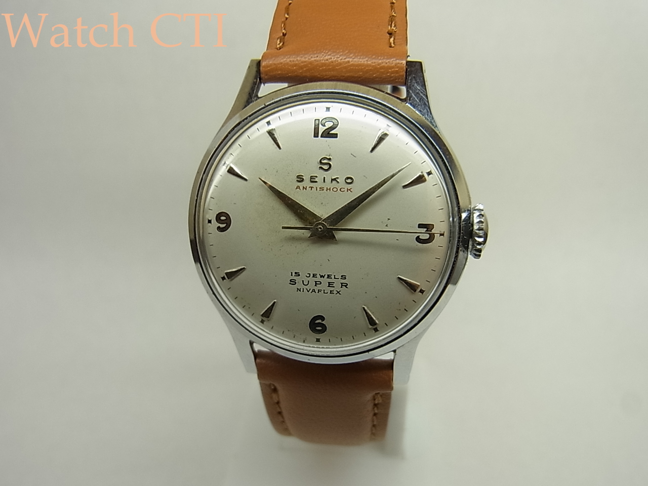 セイコー社初の耐震装置「E-1」が搭載されておりますが、この装置自体はスイス製で1954年(昭和29年)製以降の15石と最後年の17石ヴァージョンに採用され販売されたものです。総生産数は結構あったようですが、現在ではスーパー自体が実用で淘汰されてしまったようでバランスよくまとまったコンディションの品は少なくなりました…..。