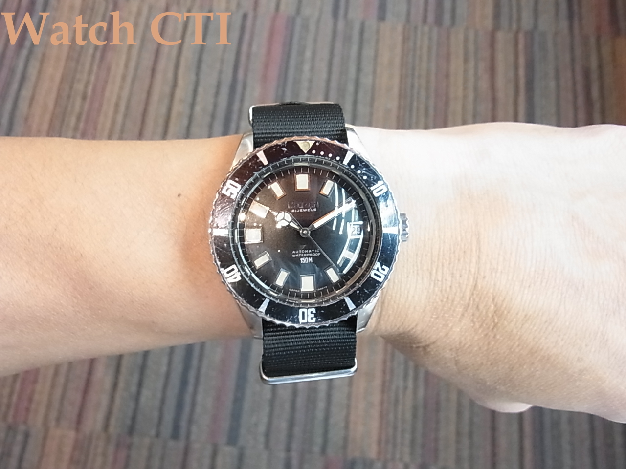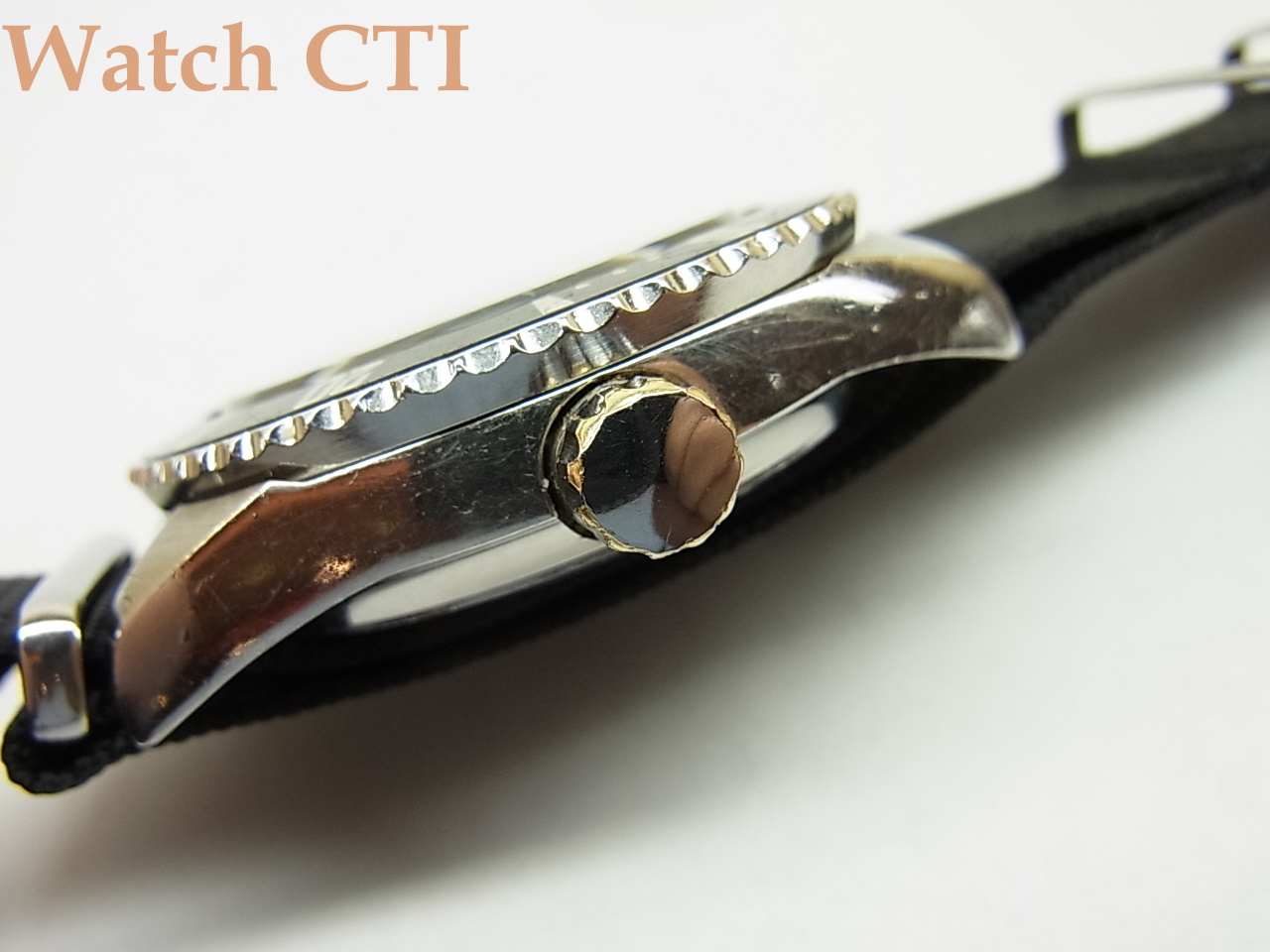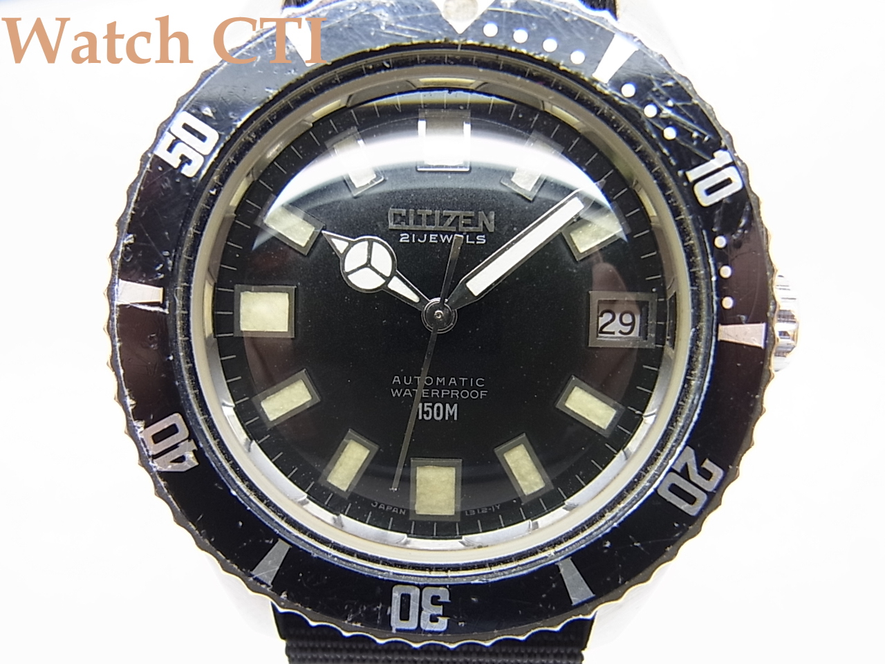 なお、リューズはスクリューダウン式ですのでとりあえずこの製品が世に出る以前に国産各社が打っていた「150m防水モデル」としては現品が一番信用のおけるモデルであったはずですね!武骨なデザインで個人的には大変好きな一本です。程度の良い品の現存数も相当少なくなかなか纏まったコンディションにはお目にかかれません….。現品は嬉しいことにガラスは純正新品に交換済みです。