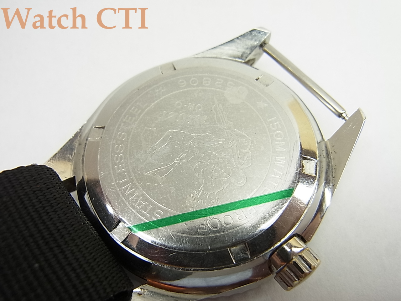 まずは搭載されるキャリバーですが、非常に小さく5430と打たれているのです…..33石の5410を搭載したクリスタルデイト”ダイバー”が1968年に製造されており、当モデルと外観的にはアウター回転ベゼルや文字板インデックスなどほぼ同一デザインなのです。推測すればこの5410をベースに21石にダウンしたキャリバーを搭載して150m防水に特化したモデルとして販売したものと考えられ、54系ベースではありますが、シチズンとしては初の「ペットネーム」から独立したダイバー専用モデルの誕生と言えると思います。文字板にDIVERの表示は入りませんが、ケースバックに入る嬉しい潜水士レリーフの下にDIVERと控えめに入っているあたりは何とも慎ましやかではあります!と云うわけで現品の製造初年はクリスタルデイト5410と同じく1968年(または翌1969年)でしょう。