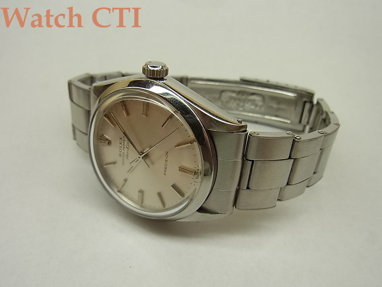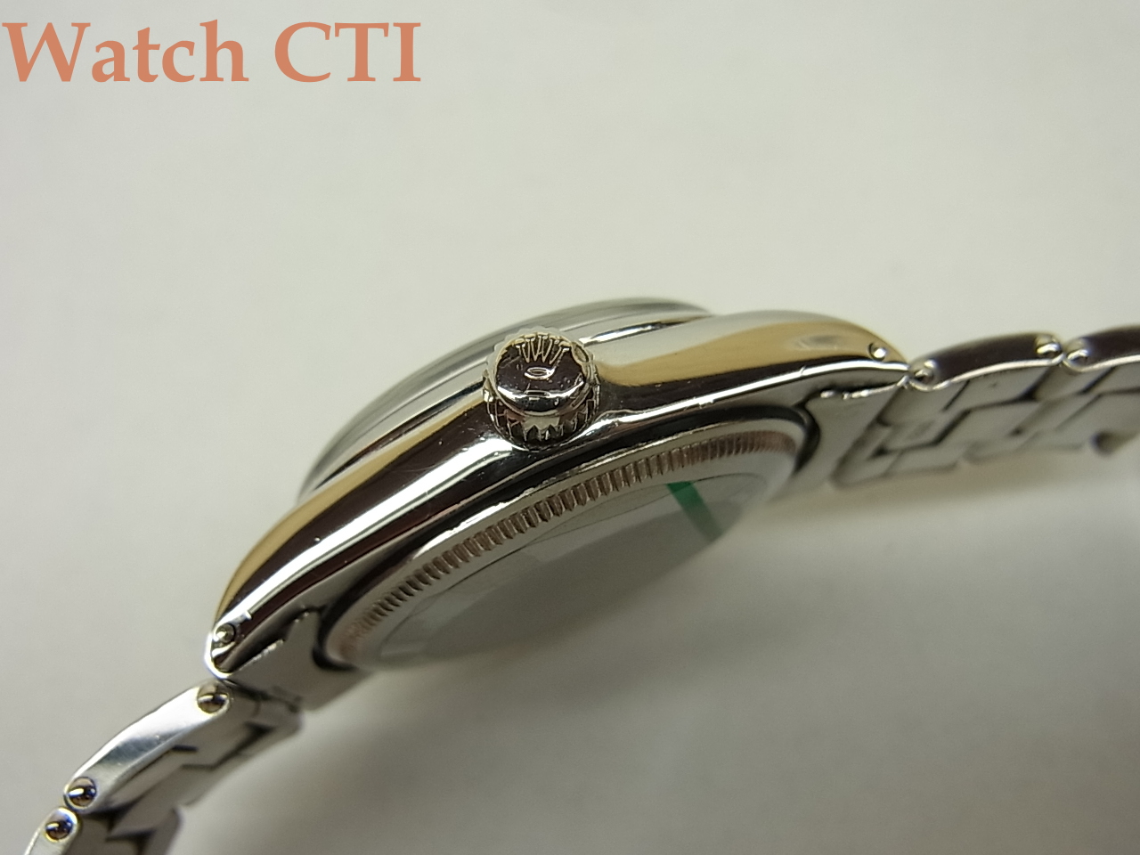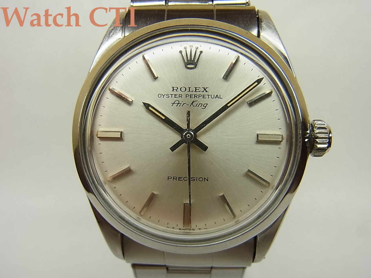 現行品ではクロノメータームーブになっておりますが50年代末にリリースされた当初からサファイアクリスタルになった初代モデル1400xまでの40年以上にわたりごく一部の例外を除きプレシジョン(PRECISION=正確)表記を文字板に入れた自動巻の標準機であったわけで、廉価版ゆえに相当数が製造され市場に流通していたものでした……..が、です。その初代エアキングのプラスチック風防モデル5500/1002が今や市場から姿を消しつつあります….。ヴィンテージウオッチが日本で盛り上がりだした当初、80年代最後期にはまだ現役モデルであったエアキングが、いよいよヴィンテージの仲間入りとみてよいかと思います。