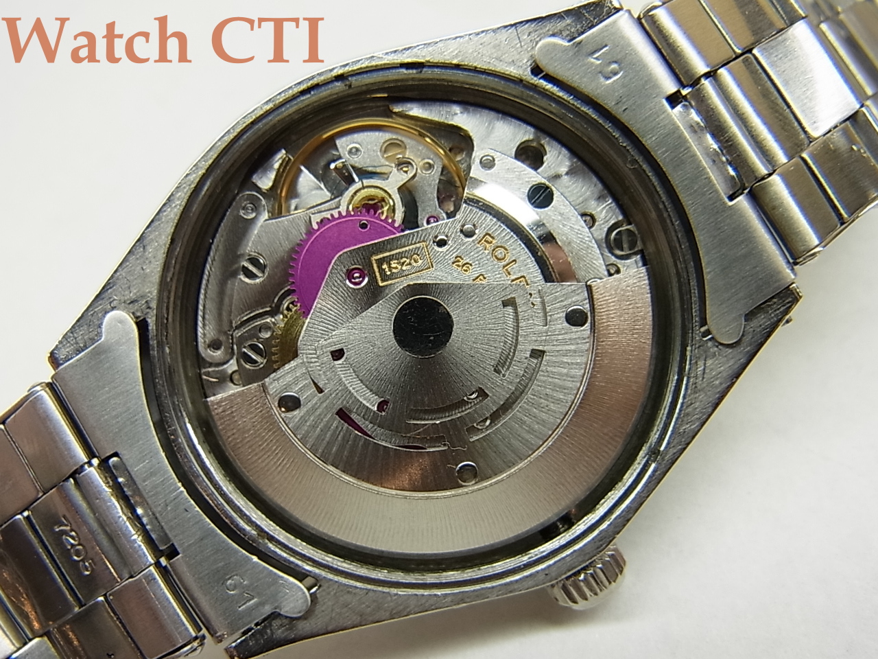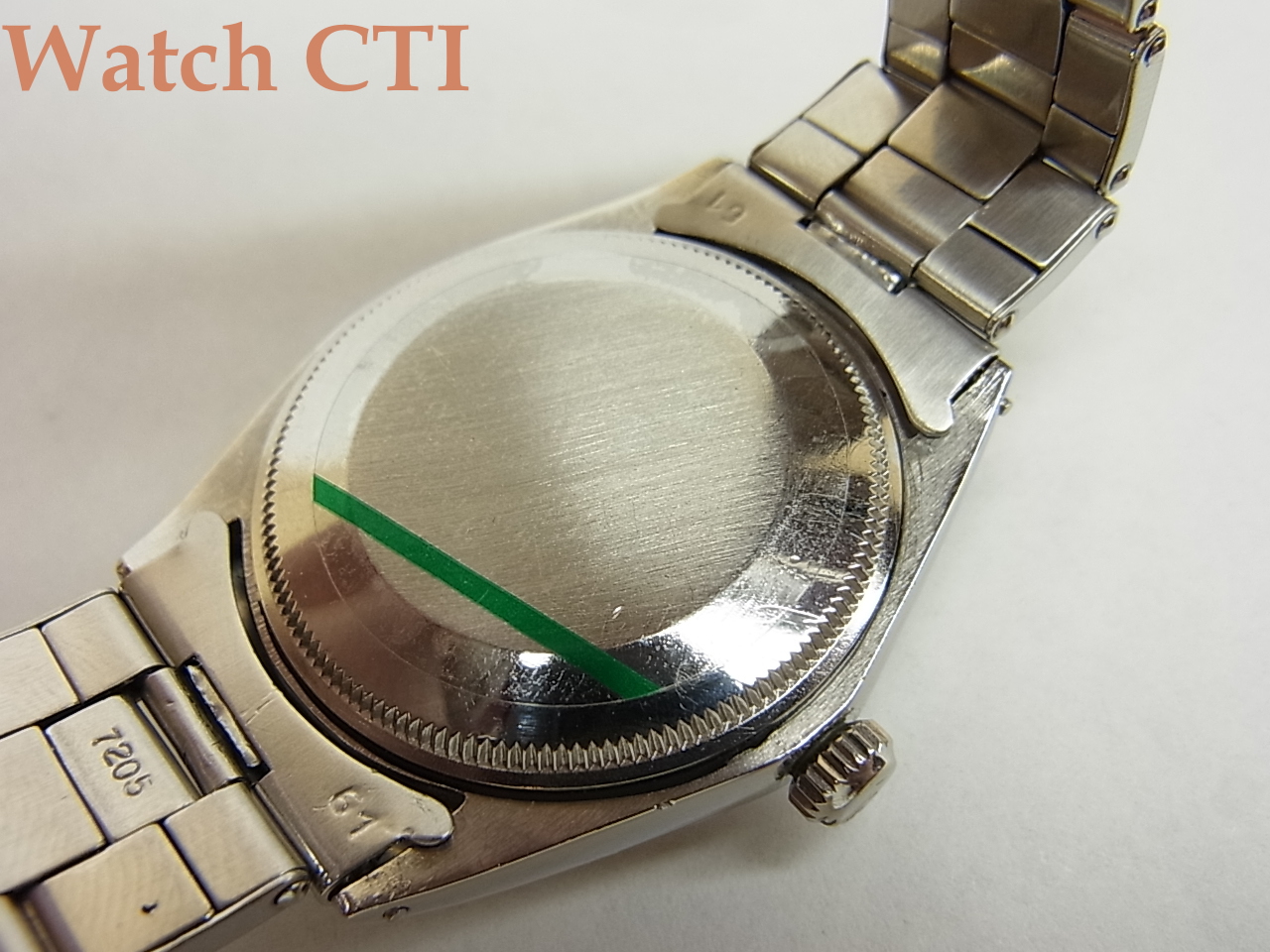 *現品は5500のケーストップに1002のケースバックを持つものですが、この組み合わせで「純正」です。古くからのロレックスファンには既知のことでしょうが新しくファンになられた方々には{?}なことでしょう。実際ケースバックも5500の製品も多く流通しております。なぜバックのみ1002があるかといえば、推測ですがロレックスとしてはエアキングのクロノメーターヴァージョンと言える1002とバックの部品を共用したと考えるしかないようです。なお、現品のケースミドルのシリアルナンバーは研究資料に照らすと1966年製造。ケースバックの製造年/四半期刻印は69年第一四半期です。付属するオイスターリヴェットブレスはエクステンション式ですが後年にエクステンションに改めたものかもしれません。非常にスムースに作動しております。年式は66年第一四半期の刻印がクラスプ内にございます。