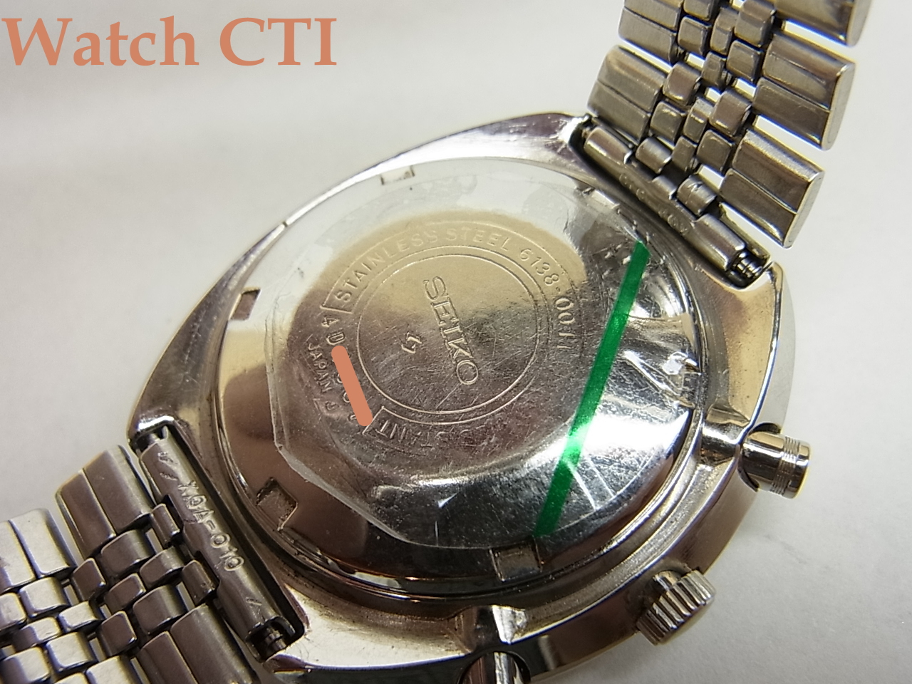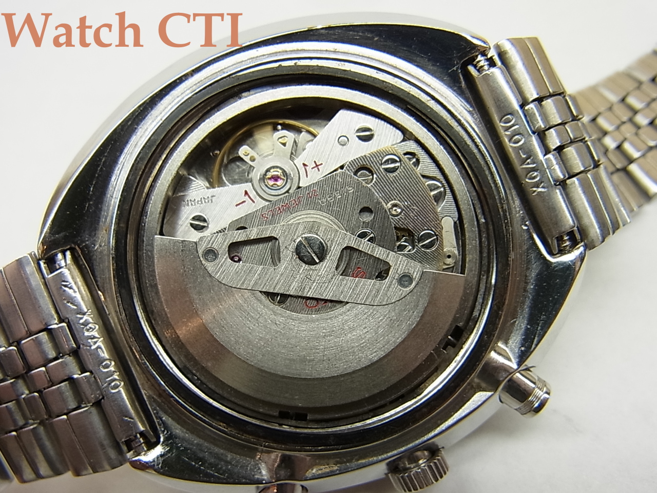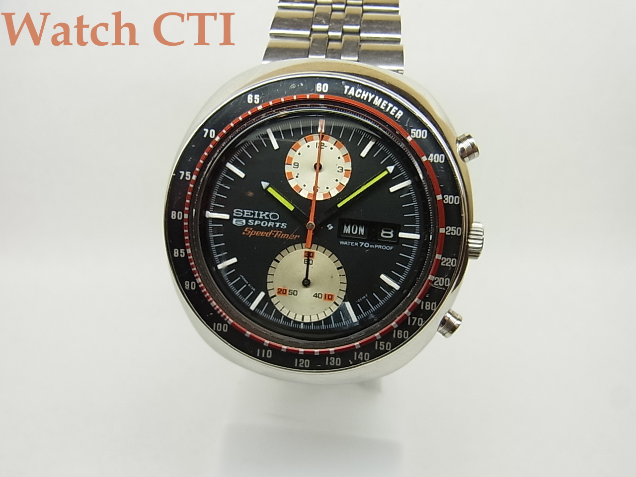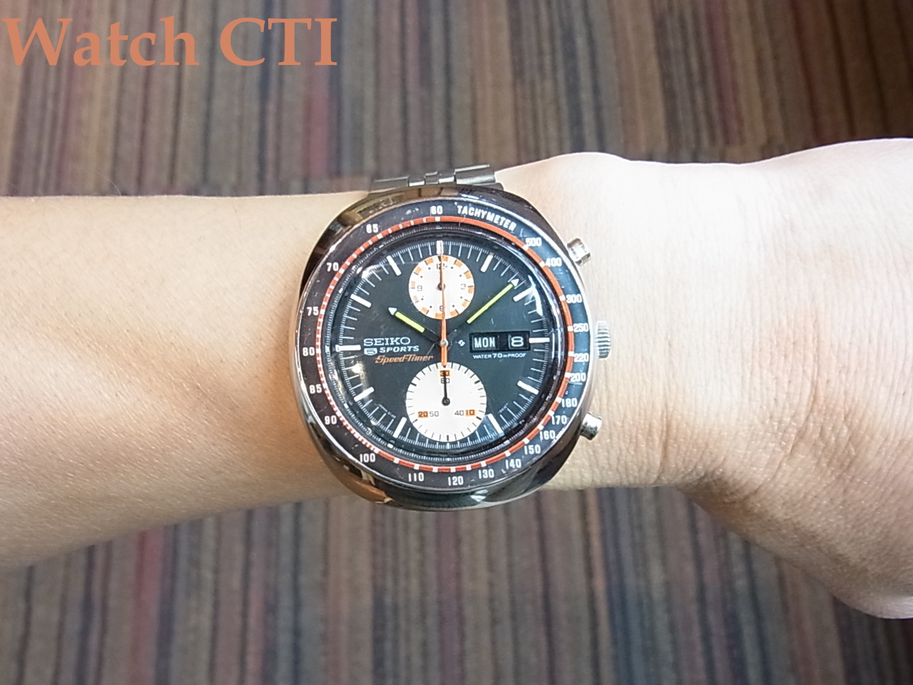 現品もその例に漏れず残念ながらSEIKO銘のみの汎用ブレスに交換されておりますが、致し方ない処でしょう。また長短針の夜光は後入れで、ちょっと緑が強い色になっております。クロノグラフ針も経年劣化のためでしょう、塗直しされて元色に近いオレンジ色になっており、またセンター部分に針穴を隠したかったのでしょうか?金属のキャップが後付されております(違和感なし)。このクロノグラフ針は、オレンジをモチーフカラーにそこかしこに使っている現品ゆえに、差し色としては気の利いた選択かと思えますね!