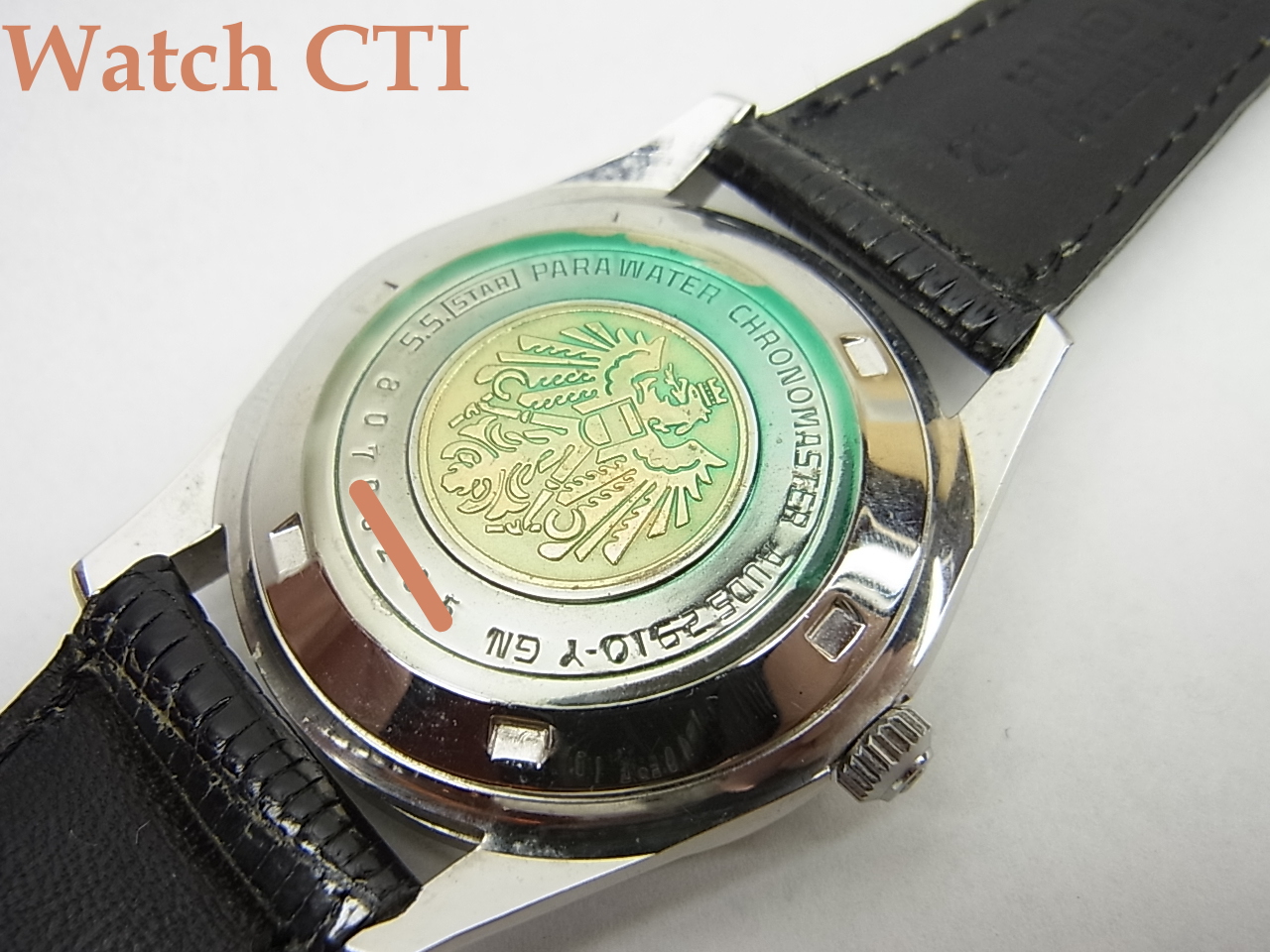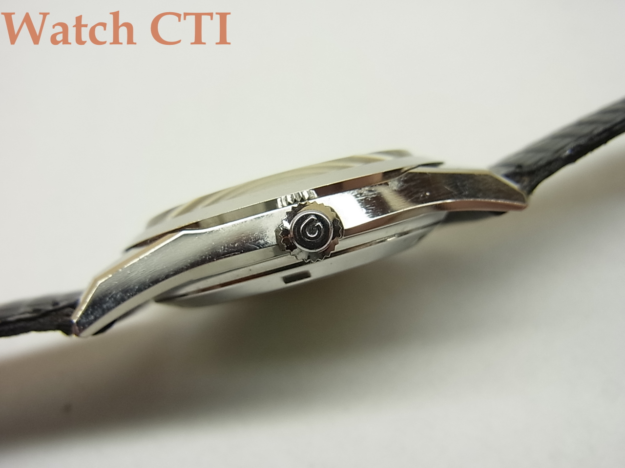 *デッドストック未使用品ですが、時計店で棚卸され長らく眠っていたものでやはり少々「棚ずれ」や保管による瑕疵は見られます。残念なことに純正ベルトの6時側はおそらく崩壊してしまって欠品しており12時側のみ付属しておりました。貴重な14mmサイズの革張りバックルはそこに健在ですのでこの点は不幸中の幸いですね!ハンサムなフェイスのカレンダー表示のみも好みの方多いのでは?