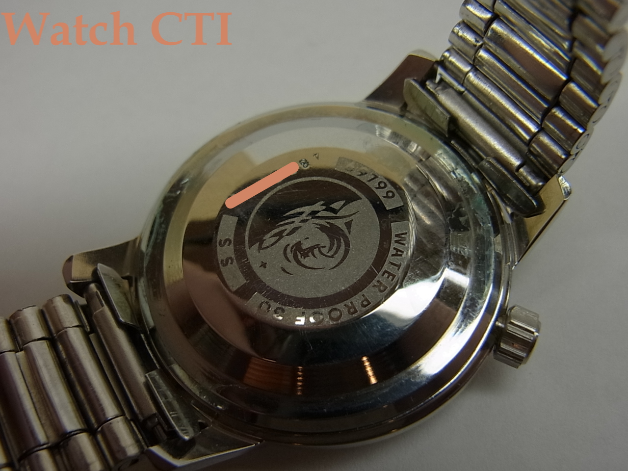 文字板に表示される通りで30m防水ですから、なんのことはない只の生活防水程度のものですが、発売当時の昭和39年の時代ではまだまだ非防水時計の方が圧倒的に多かった時代なのです……。