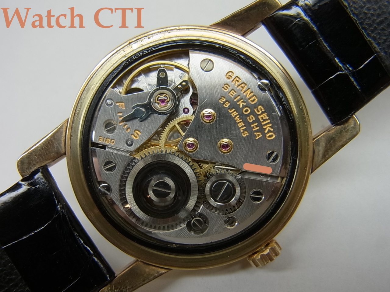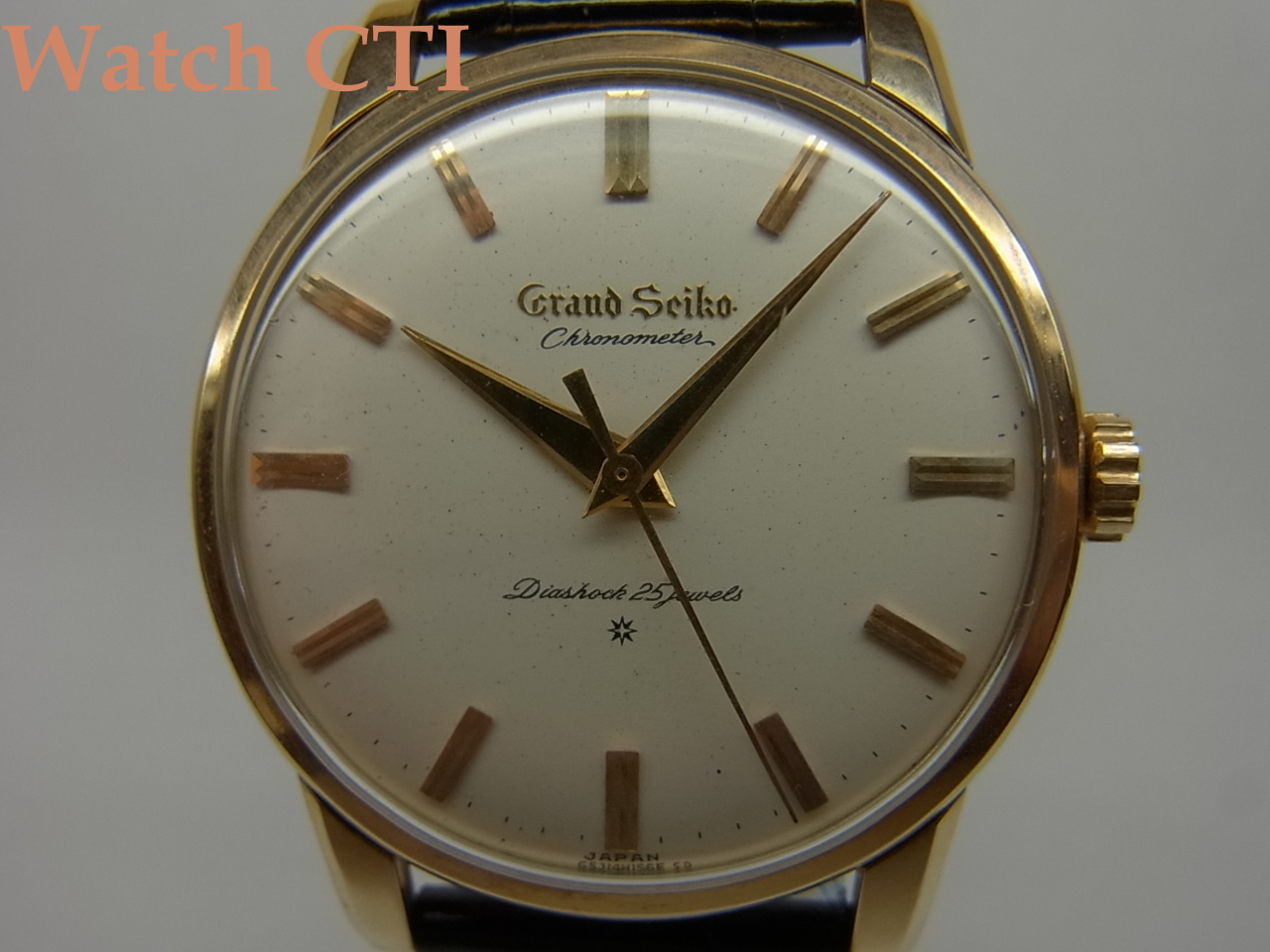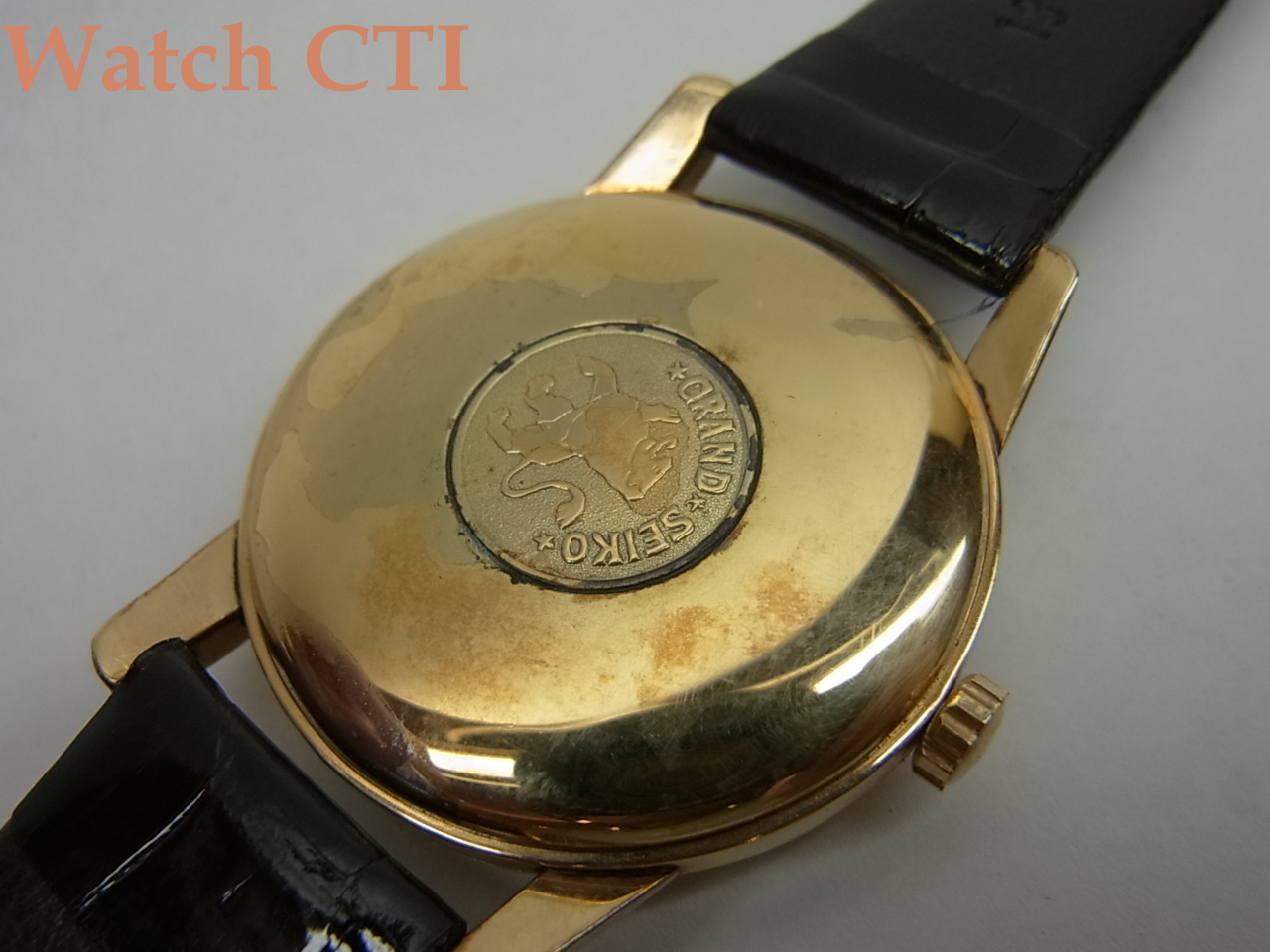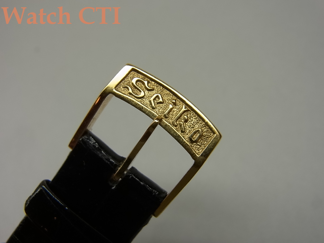 *バックルについてですが、ご存知かとは思いますが、このファーストモデルについていた尾錠は例の書体を持つGRAND SEIKO銘の鋳物製金メッキものです。今回この現品についているものはオリジナルから型どりしたと思われる後年のレプリカものです。ブロック体のSEIKO銘やGS名の後年の純正品を取り付けようかとも思いましたが、ちょうど手持ちしていたレプリカも、雰囲気を楽しむにはまずまずではないでしょうか。なによりファースト純正バックルは今やおそらく5万円でも見つからないと思いますので…..。