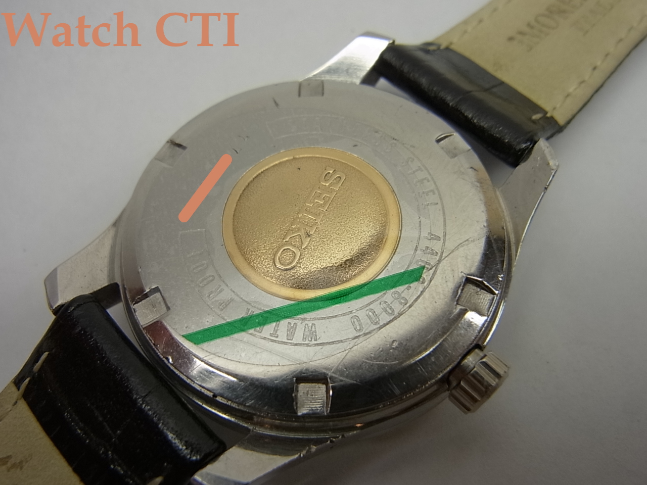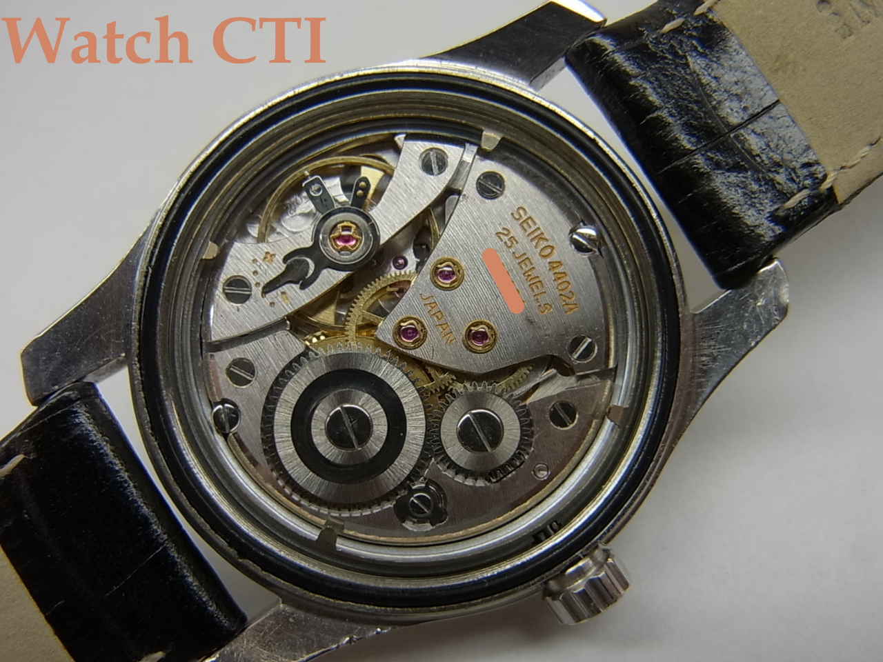 *外装・文字板とそれなりに使い込まれた状態で、ケースにはちょっと目につくスクラッチ傷もありますがハードポリッシュされていないため、オリジナルのケースラインがよくわかります。この4402-8000番ケースはセイコー製の諸モデルの中でも非常にバランス感の良い一本だと常々感じております。ケースのサイドからラグに掛けての微妙な曲線シェイプがパテックの96カラトラバを彷彿とさせるものを感じませんか?