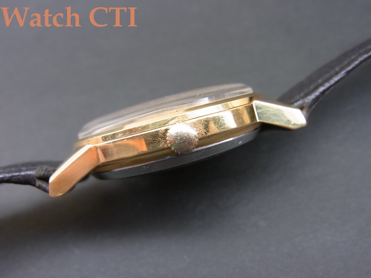 *奇をてらわない、クラシカルな外装・文字板で金メッキケースに強圧着パラウオーターケースです。デッドストック品ですが、時計店で過去50年を過ごしてきた保管状況が、それなりだったようで、外装にはそれなりの小傷・棚ずれが見られます。ケースバックの防傷コートの残りや付属革ベルトとバックがオリジナルである点は嬉しいところでしょう!