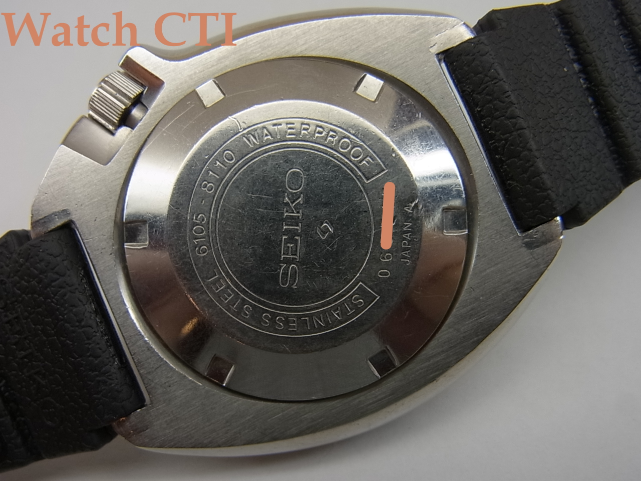 違いですが…..ケースバックのデザインが「前期型」同様でかつREF番下四桁が8110となります。この期間は結構短かったようで、流通している植村ダイバーのほとんどはケースバックデザインのシンプルとなった後期型です…..こちら