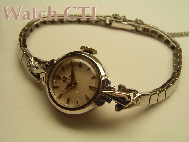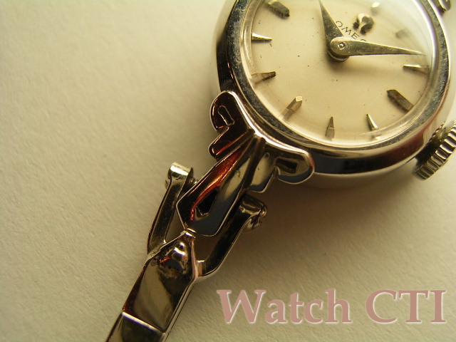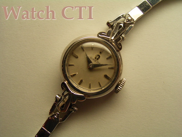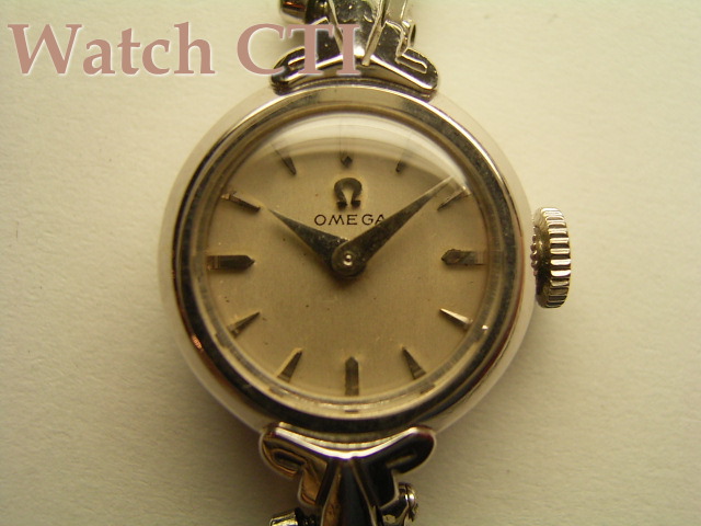 クサビインデックスとドルフィン針の組み合わせがシンプルで可愛らしいOMEGAレディースモデルです。