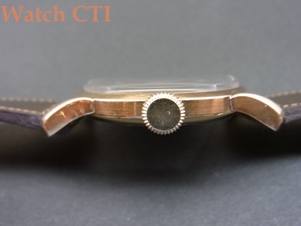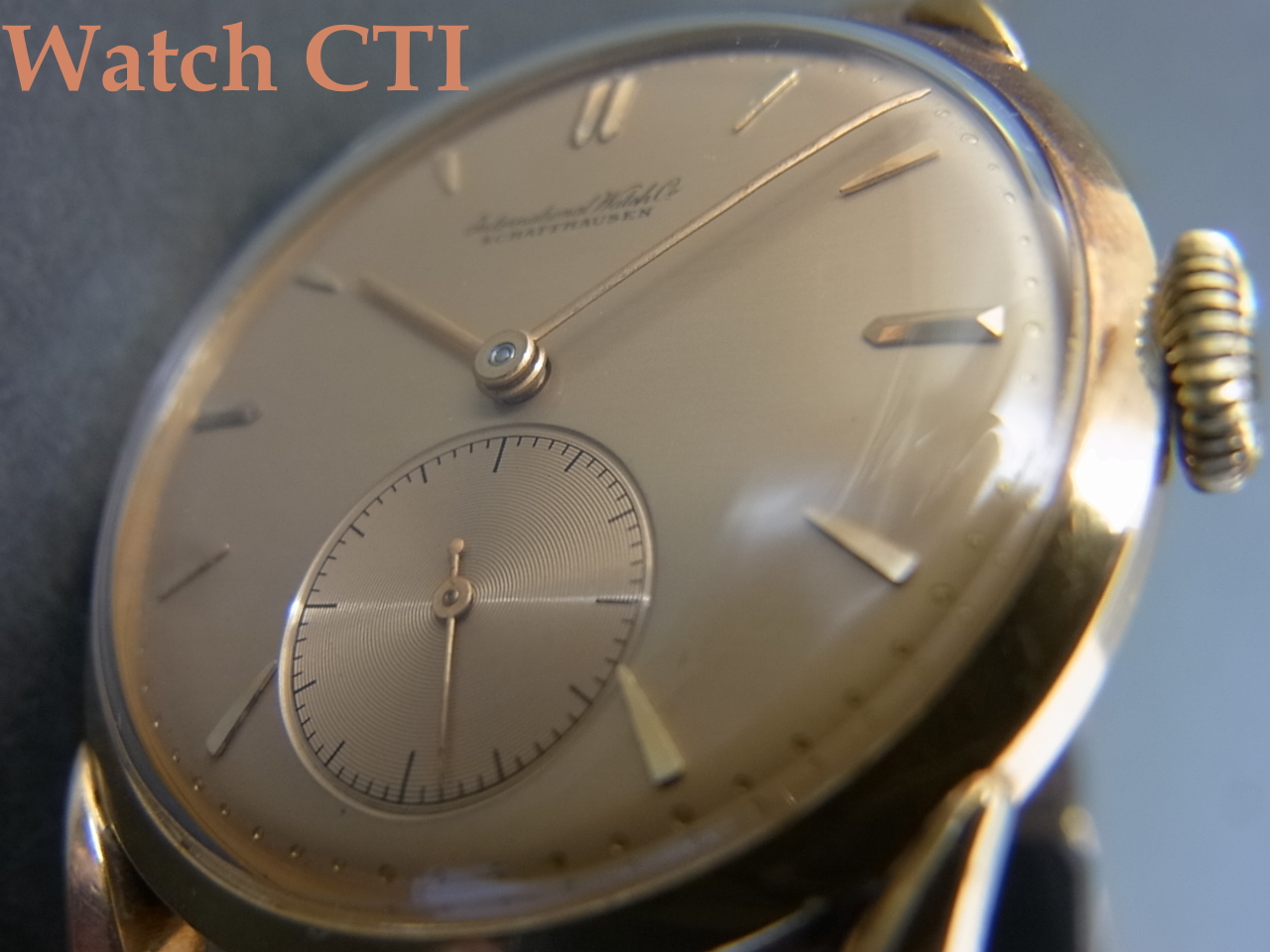 ダイアルは非常にプレーンなもので、おそらく経年した色合いは、ちょっとサーモン掛かったようにも見えるクリーム系の中間色。インデックスの楔型も押し出し感よりはそのダイアルカラーとの整合感のほうが勝り、控えめな中にも強い信念を感じさせるようなダイアルですね。パテックの35mm位のモデルでもこのような佇まいのものがありますが、このIWCもおとなしい顔つきの中にも凄味を感じます……..。