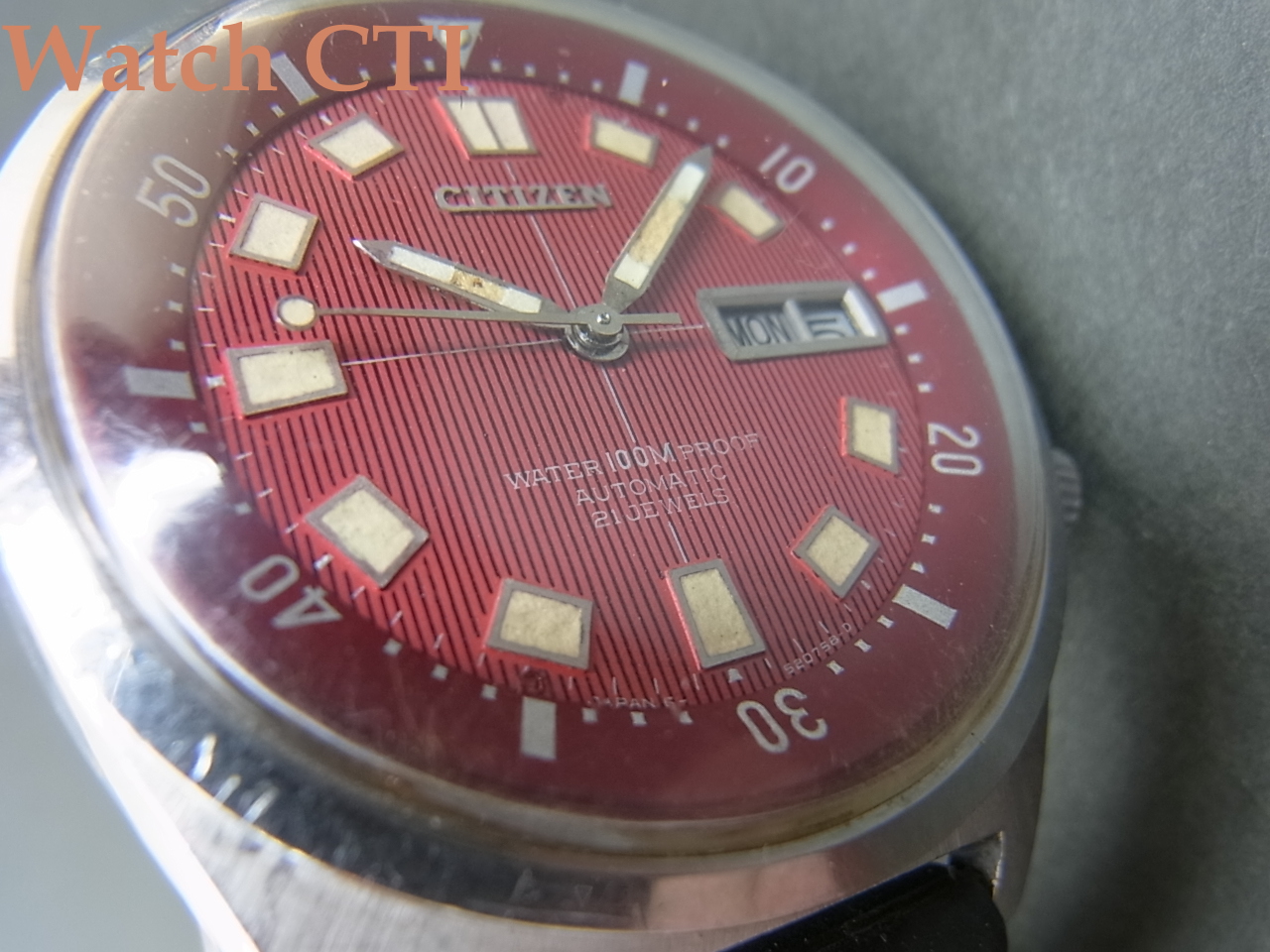 国内ではセブンスターの銘で販売されているモデルと同一のケース・機械ですが、文字板が「赤」….この色は国内では出ていないような気がします…..黒がほとんどで、たまに青がでますが、国内7スターで赤は見た覚えがありません……ひょっとしたら国内ものでもあるのでしょうか??いずれにしましても、現品は海外仕様ですので国内ペットネームである7スターの表示はございません!