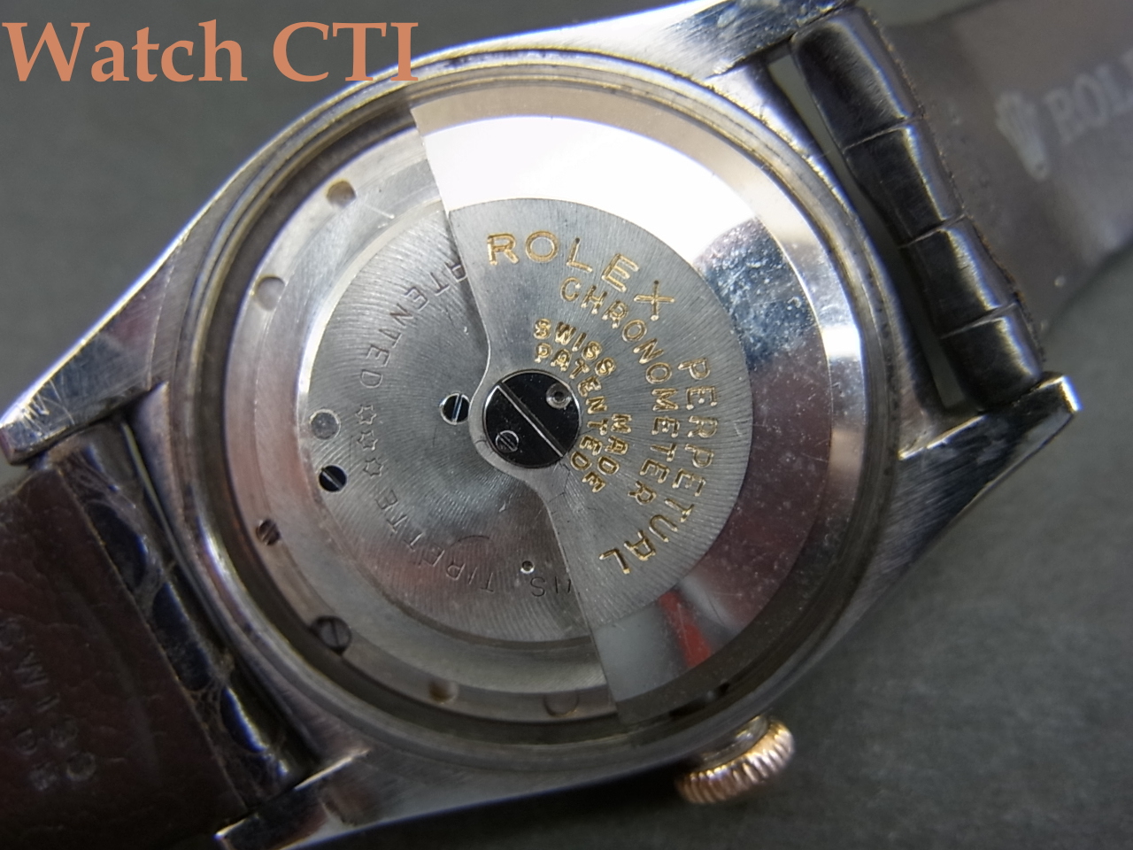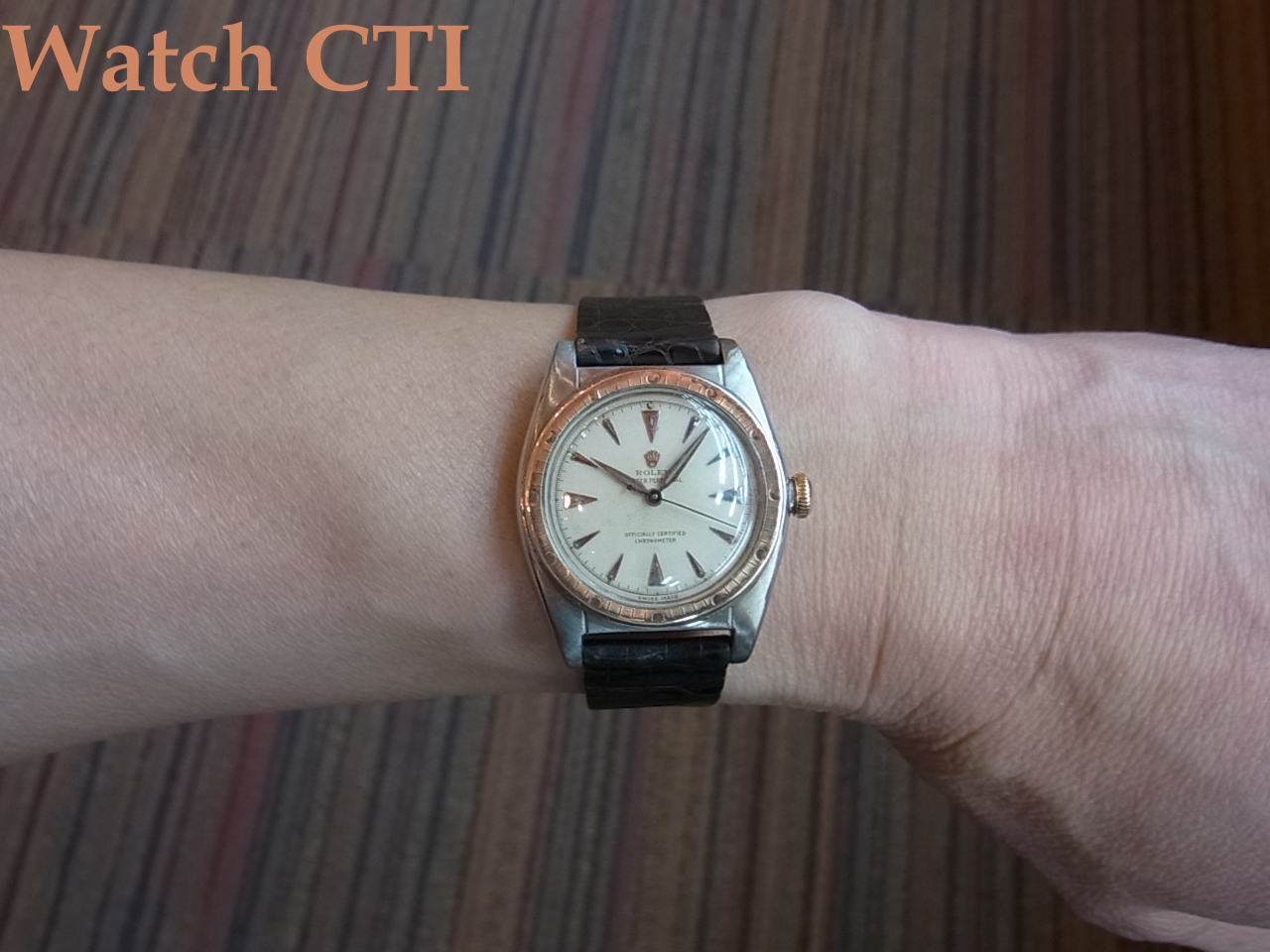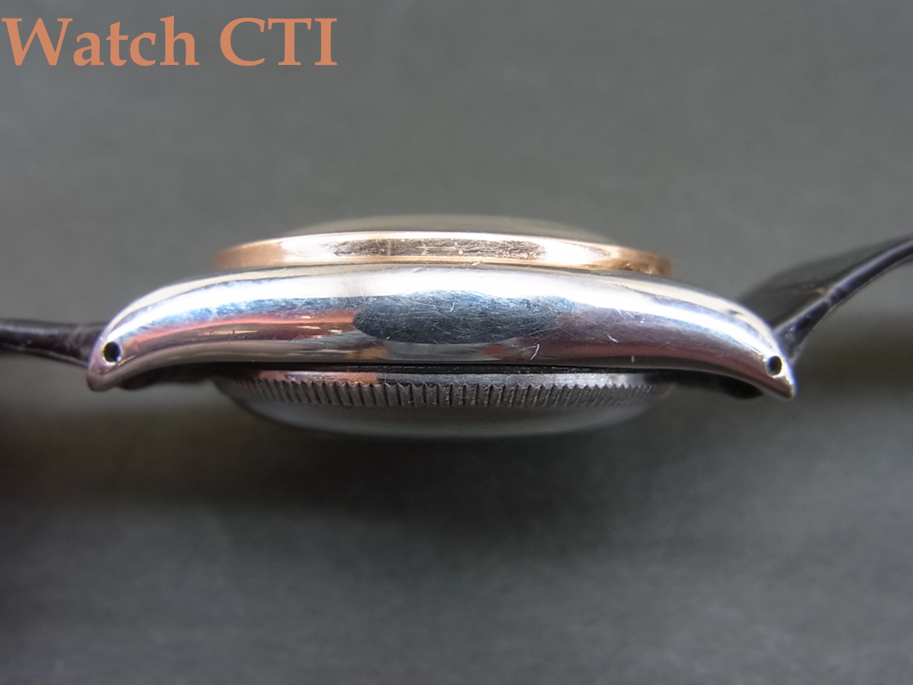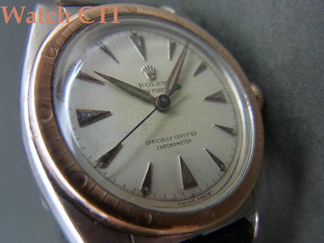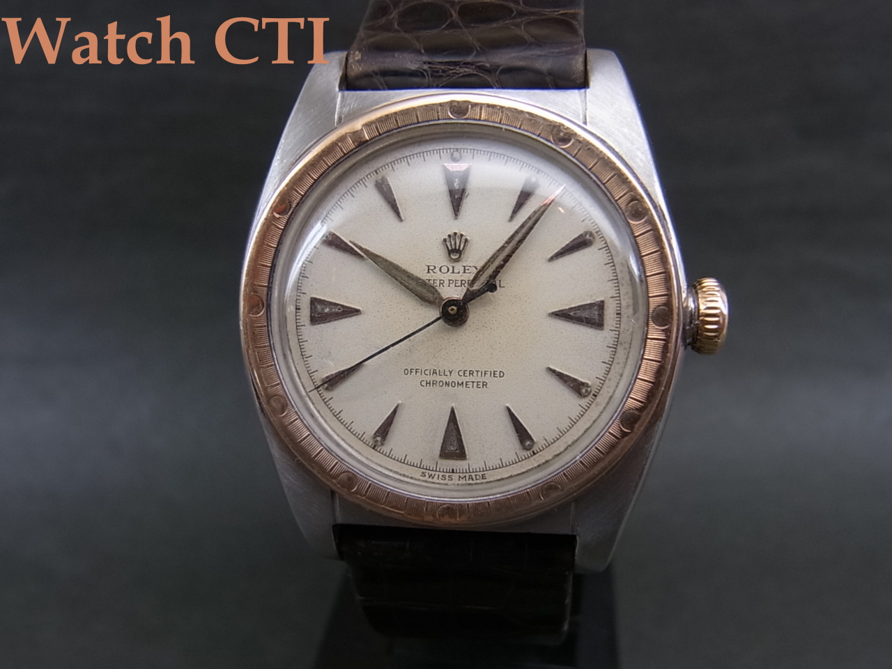 ピンクゴールドカラーのベゼル/リューズ/インデックス/長短針とステンレススチールのシルバーカラーとが織りなすツートーンの色合いも如何にもヴィンテージですね!パウダーホワイトダイヤル表面の経年変化具合もヴィンテージらしさに溢れます。