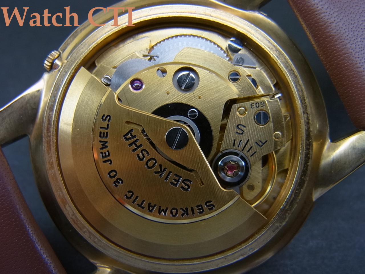 30石のマチックには後年「マチックスリム30石」の名称で出た83系薄型機械もありますが、こちら現品のキャリバー603は後の62系の直系初代となります。高級機を意識した金メッキ仕上げで機械も見た目に美しいですね!