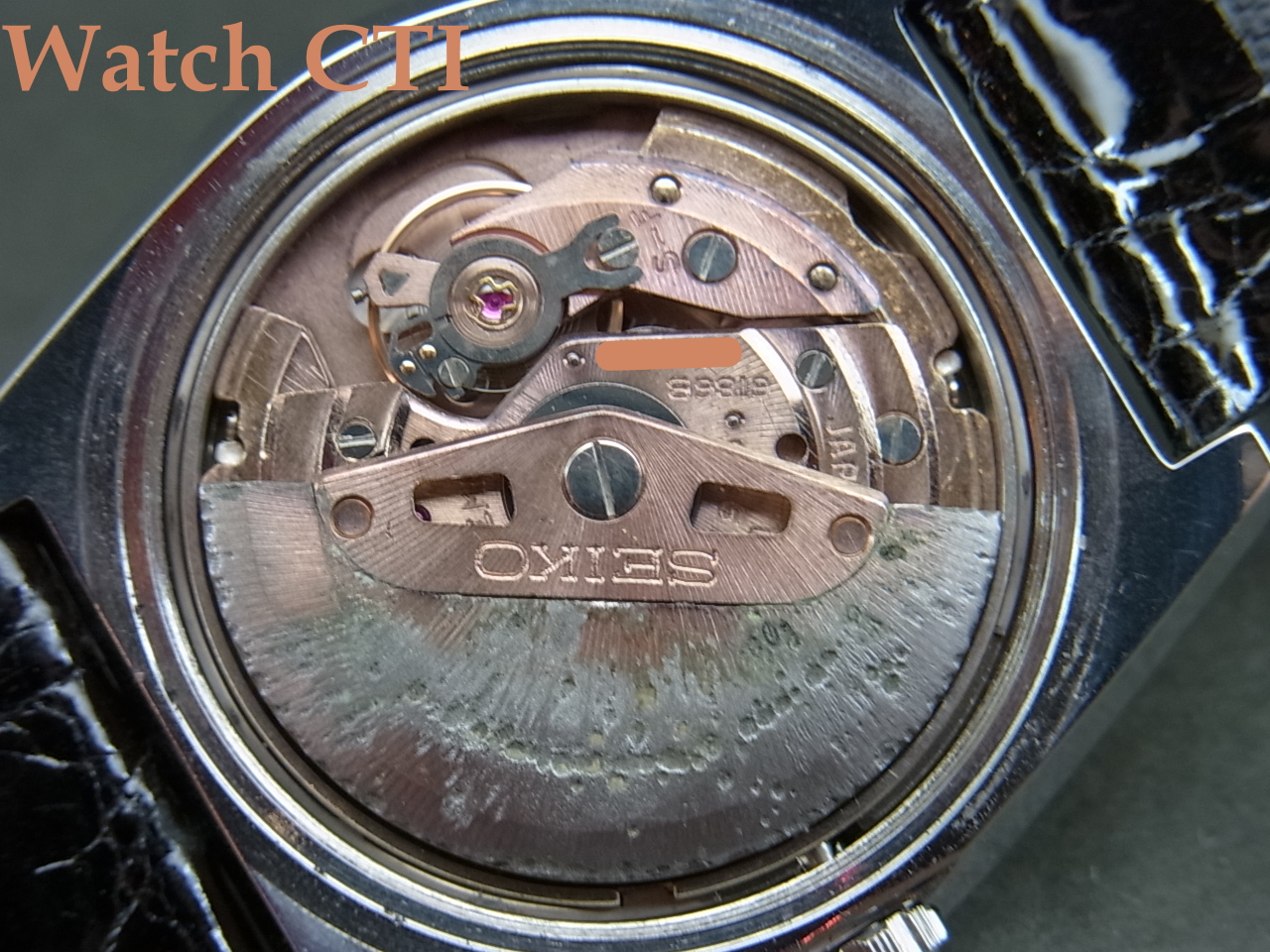 ローター自体は通常の61GSと全く同じ構造ですすが、VFA仕様として「赤メッキ」されたものでした。過去に販売したVFAにもしばしばこのような腐食やあばた・錆がでたものを結構な数みておりますので、推察するに通常の61GSなどのロジウムメッキ系のものよりもこの赤メッキは耐腐食の面で劣っているように思います。見た目でオメガような赤機械を想定したのでしょうが経年耐性までは設計段階で想定できなったのではないでしょうか……