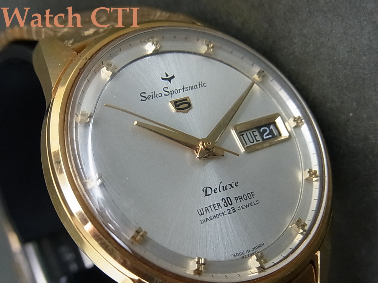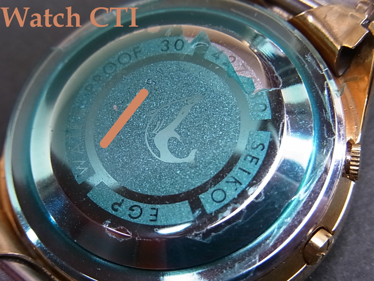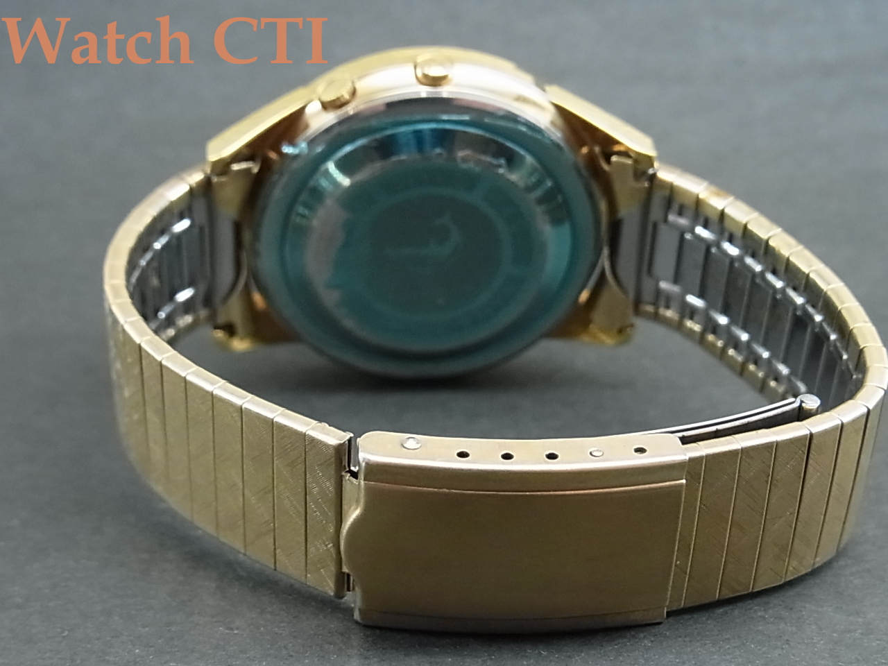 ブレスレットに銘は入りませんが、当時純正で装着していた物に間違いございません。あの頃の国産メーカー品はまだ自社銘をブレスに入れるところまで至っておらず、多くの無銘ブレスが装着されていました、この後すぐにクラスプ内側に何らかの銘や刻印が入る時代になりその後即バックル部分にエンボスされる現在見慣れた純正ブレスになります。紺れらの無銘ブレス時代の製品はむしろ希少なんですね。
