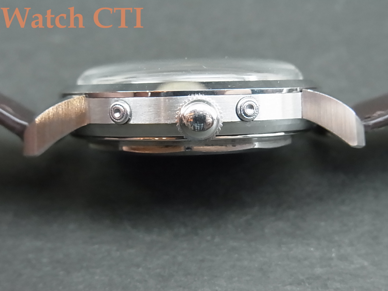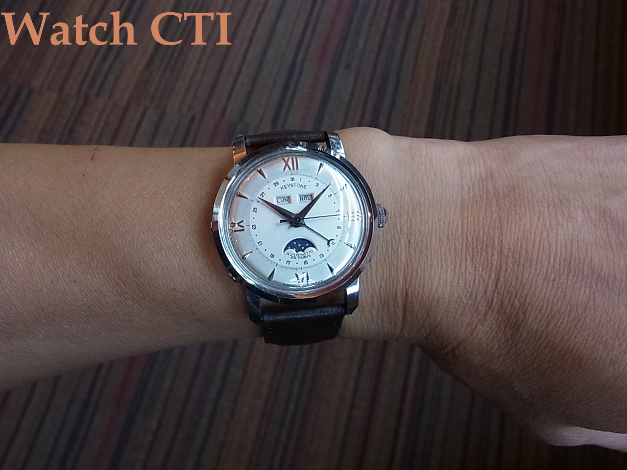 ☆ブランド銘としては私は初見でしたが、ムーブメントはエボッシュ・フェルサの自動巻にムーンカレンダーを組み込んだもので、月齢・日付・曜日・月の、4つすべてのディスクをケースサイド仕込んだプッシャーで早送りできる優れものです!