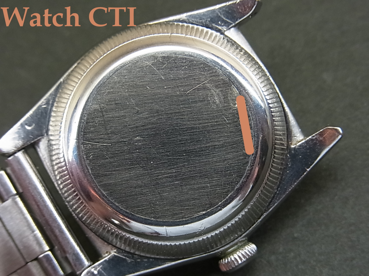 後年のラウンド型ケースバックのモデルに比べてケーストップ自体が張りのある太さを持つ仕様で、現品にもその雰囲気が良く出ていると思います。