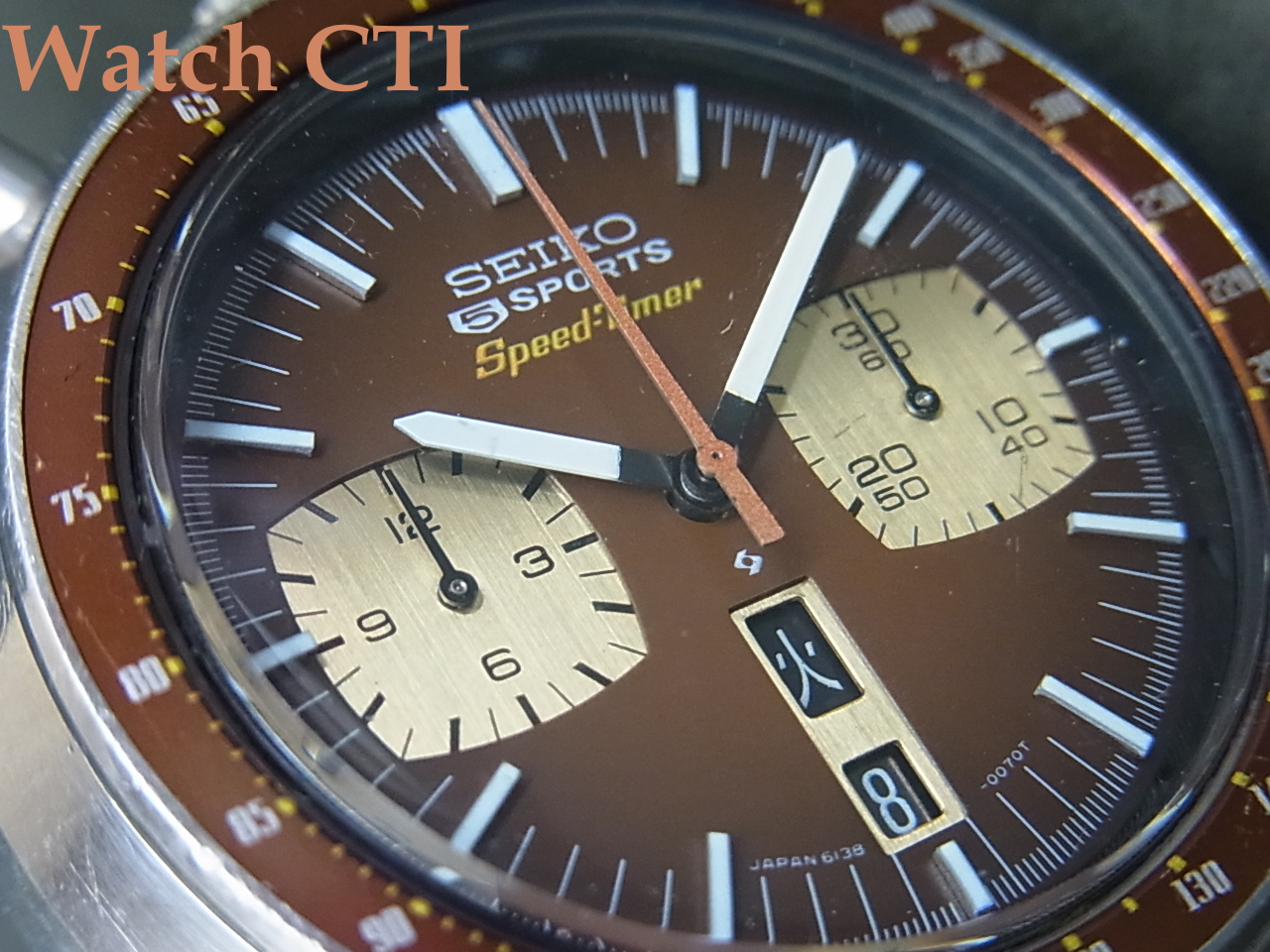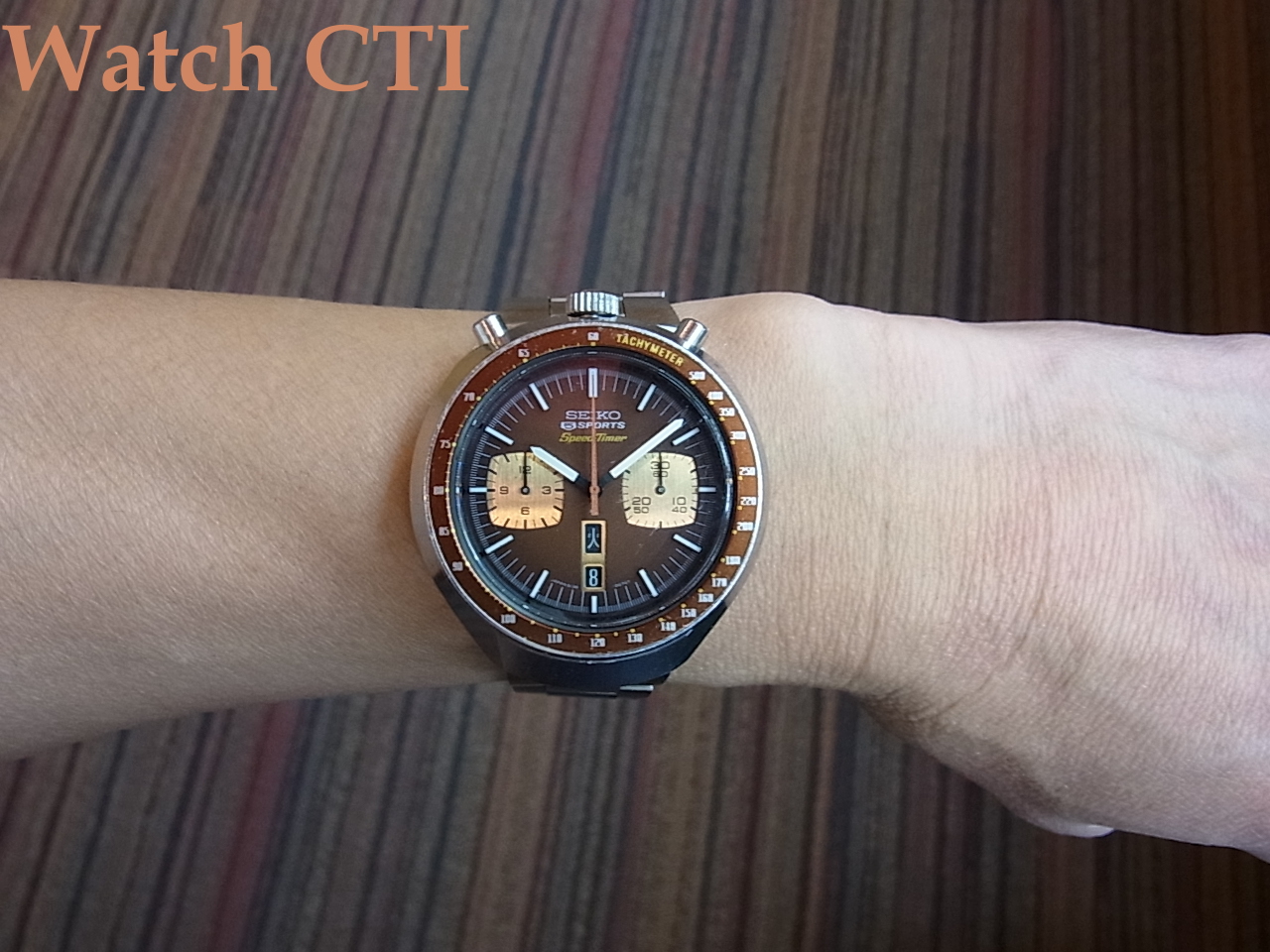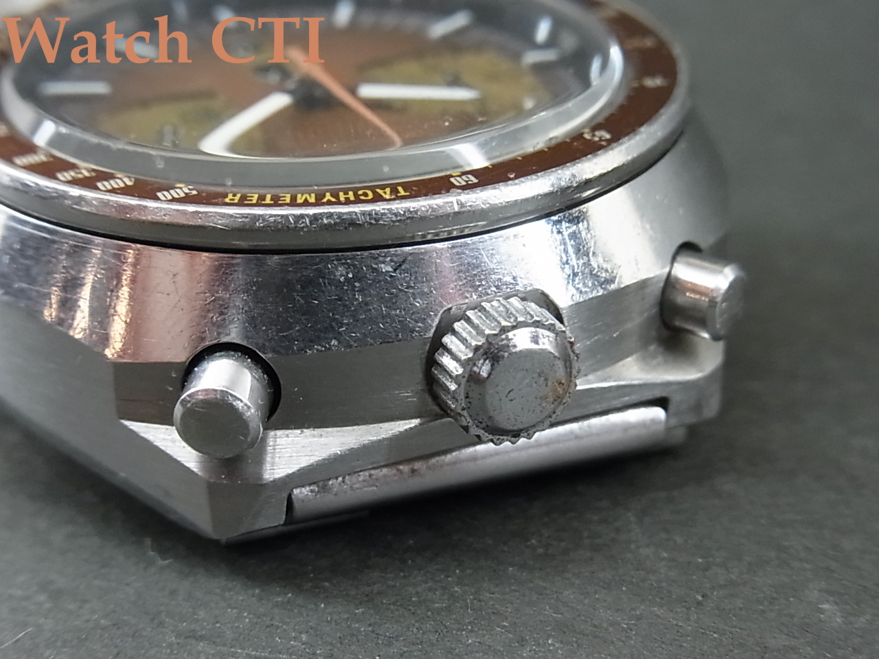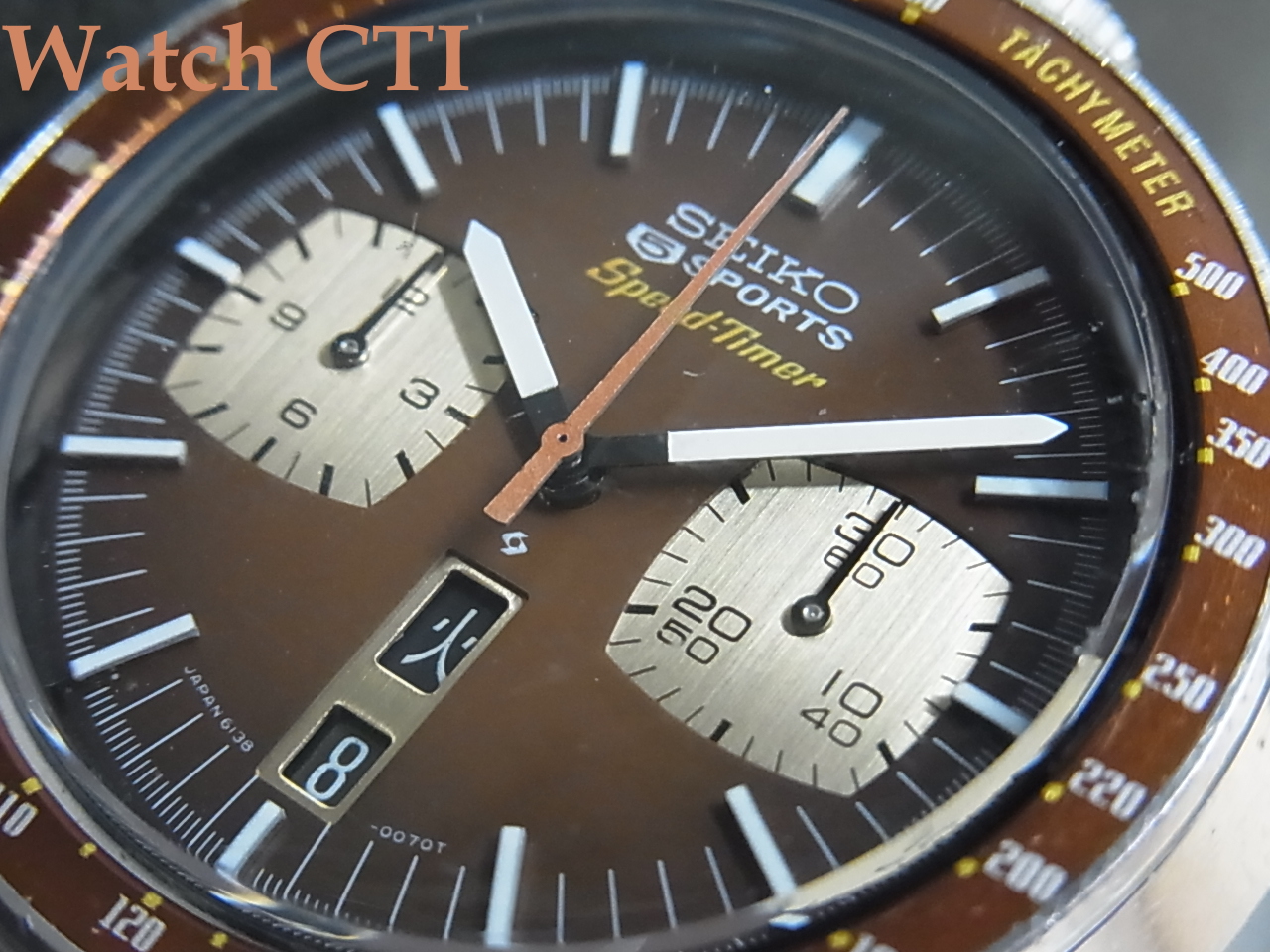 国内仕様はファイブスポーツスピードタイマーとして販売されましたが、その最後期には文字板から5 SPORTSの銘が消え、SPEED TIMER表示のみになります。5 SPORTS付きの方がありがたいような…….
