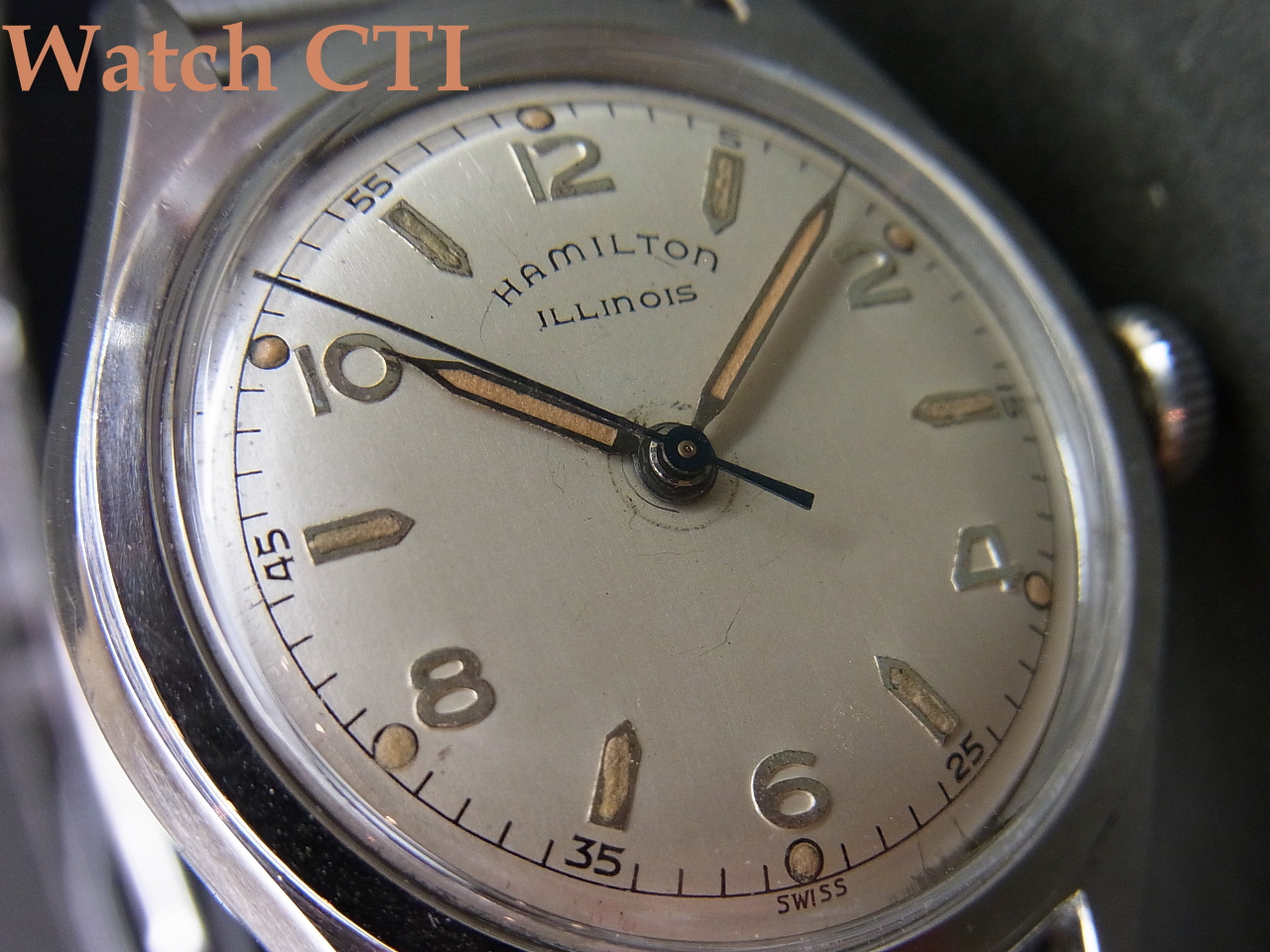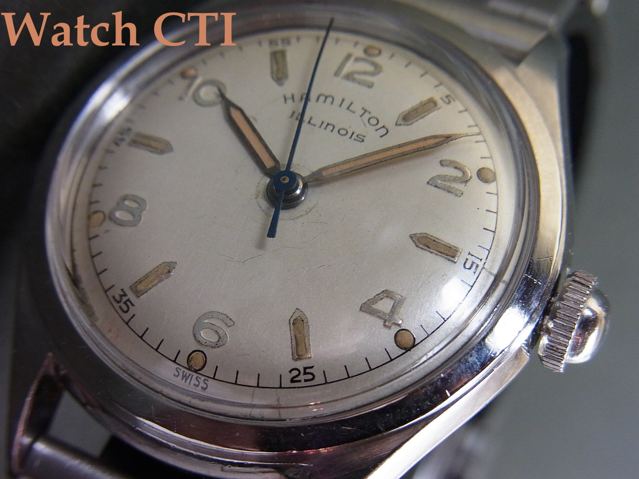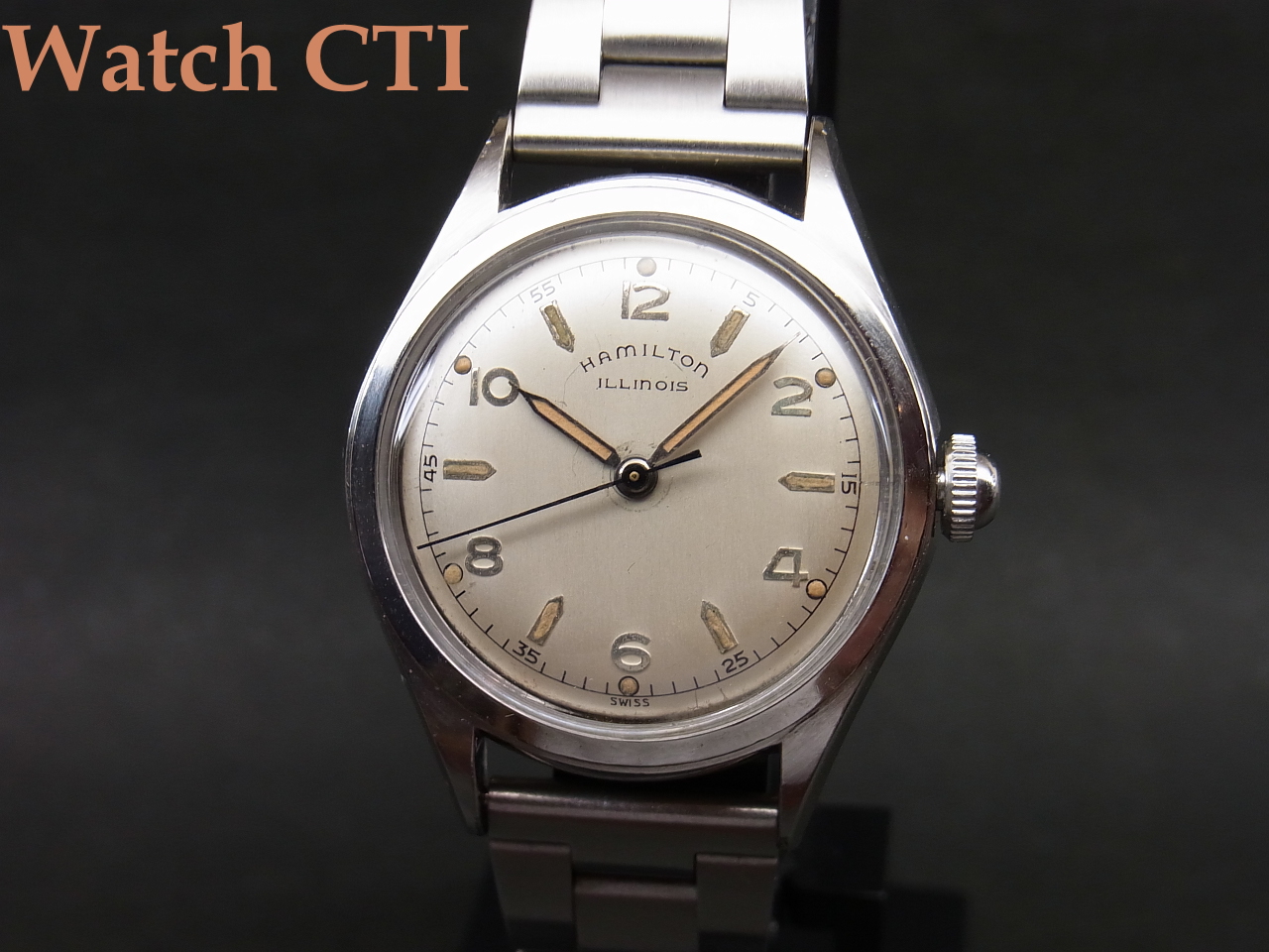 ☆イリノイはアメリカ・イリノイ州に1870年に創業した時計メーカーで、特に懐中時計の名機”BUNN SPECIAL”等で名を成したメーカーです。懐中時計のみならず、自社製小型ムーブメントをアメリカ内の宝石店などに卸したものがケーシングされ腕時計としても流通しておりました。その後1928年にハミルトンに買収され、ハミルトン/イリノイとなりますが、以降も自社製ムーブメントを腕時計用に供給し、また自社ケーシングした製品もリリースしていたようです。1950年代に入りハミルトン主導のもとにスイス製ムーブメントを搭載するようになった当時の製品が今回入荷したものとなります。