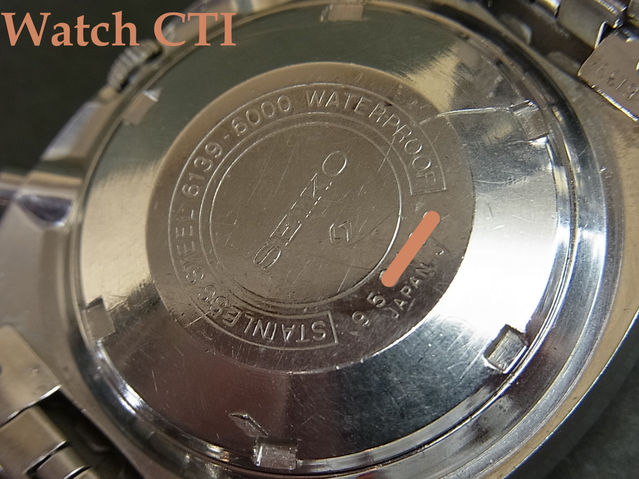 初期型は、細かな点で後期ものと違いますが、まず目につくのはケースのリューズが収まるヶ所に切り欠きが付いてる店。リューズの引き出しやすさを狙ったのでしょうね!それから、ケースバックも文字板もWATER PROOF表記!後年はWATER RESISTANTに変わります。文字板に入る5のマークも後年位置が変わりますし……結構違いますね初期ものは!