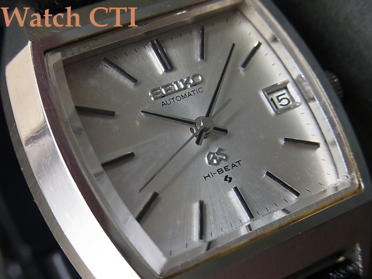 で、残念ながら、純正専用ガラスが全然見つかりません….大抵の物は何とか見つけるのですがこのモデル、ガラスは現状のままでのお渡しです。と言ってもものすごく状態が悪いって程ではないのです。表面のスレやヘアラインはほぼ気にならないレベル。唯一ガラス縁の「チップ」した箇所がチラホラ、、、、、、大きめなのは、ガラス右下側5時辺りに「ガリっ」と言う感じでやられております。2枚目画像で良くとらえられておりますのでご参照ください。その他全体には大きな瑕疵はございません。しいて言えば文字板全体が若干ヤケている点くらいでしょう。
