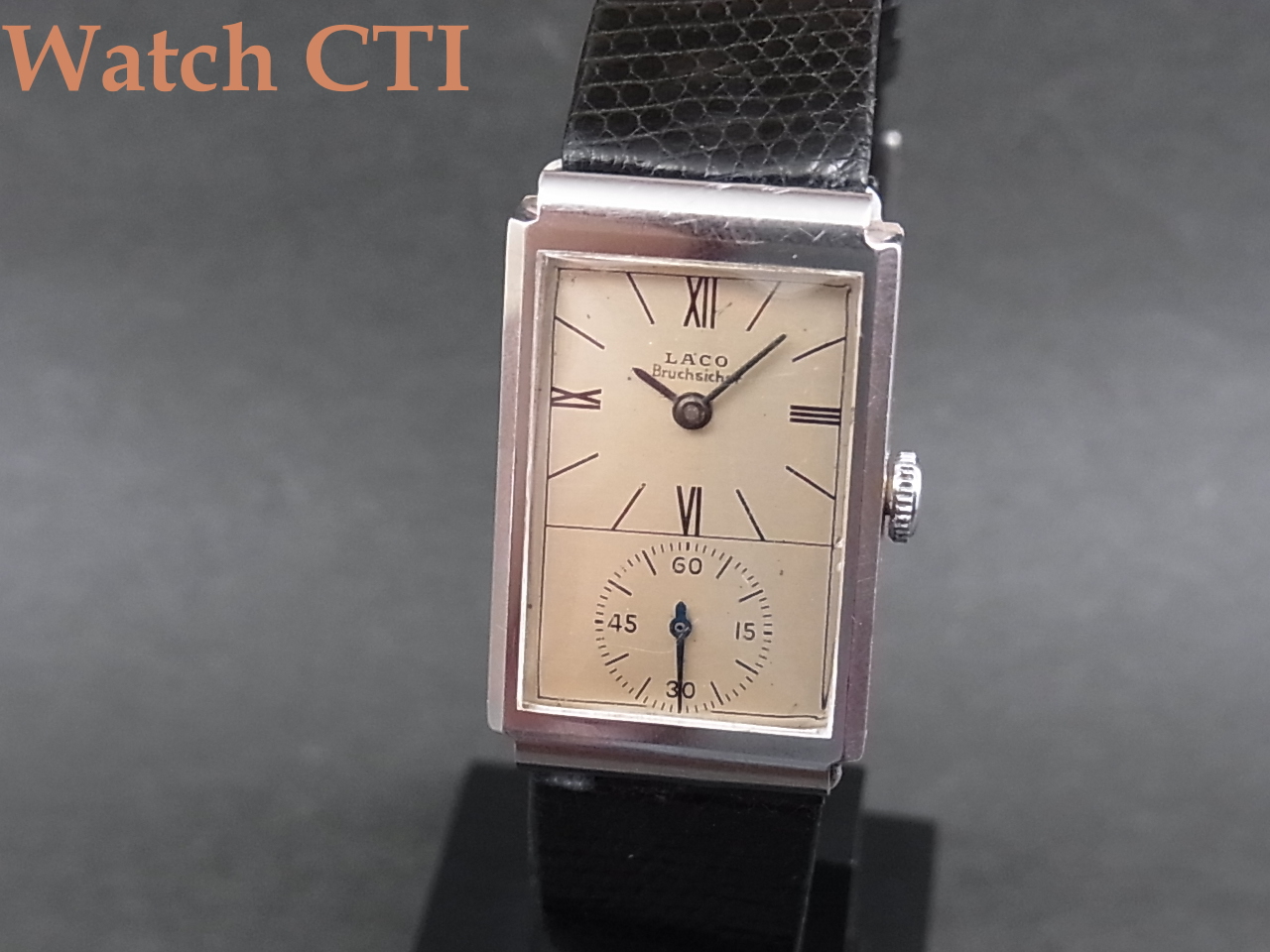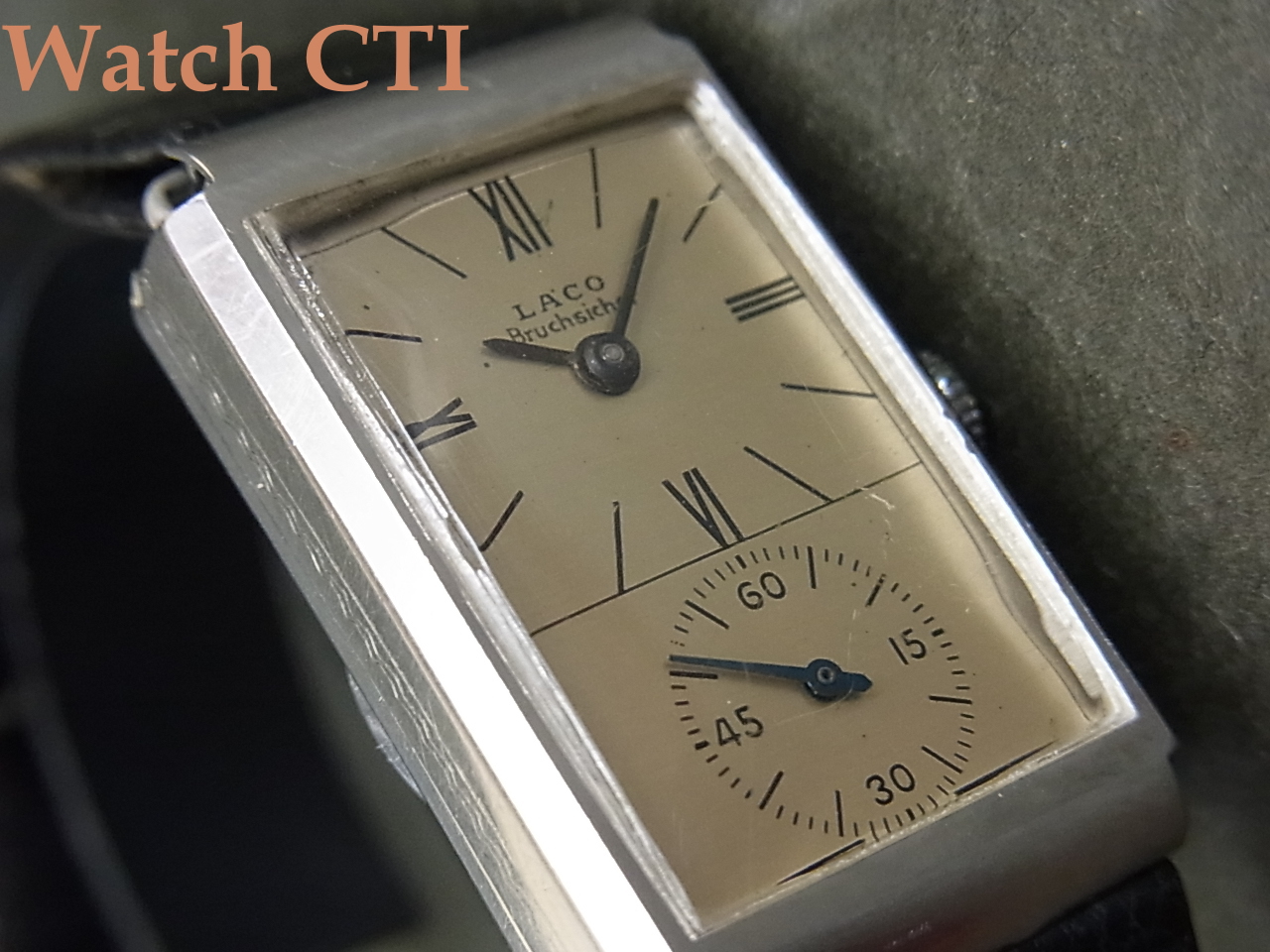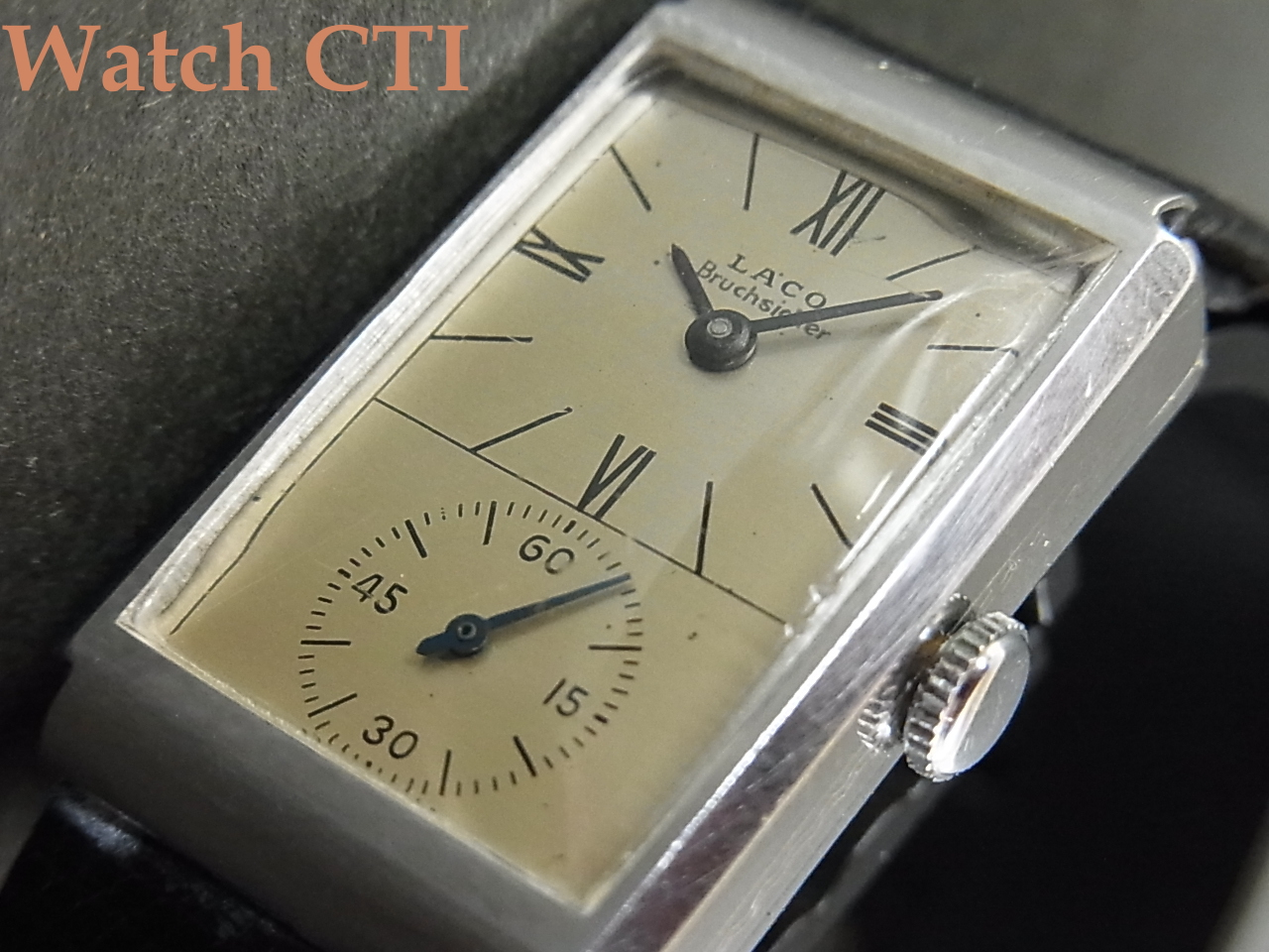 そこで…..ダイヤルをよく見てみますと….LACO銘の直下にBruchsicherと後プリントされております….これドイツ語で「耐震」の意に当たるようです。推測ですが、このドクターズウオッチ、元々耐震無しのムーブが搭載された同様製品が製造され、次いで耐震付きモデルを追加したものではないでしょうか….元来の耐震無しムーブ搭載用に作ったダイヤルに後足しでプリントした物でしょう…ROLEXなんかでも同様な後入れプリントの品がありますよね!!