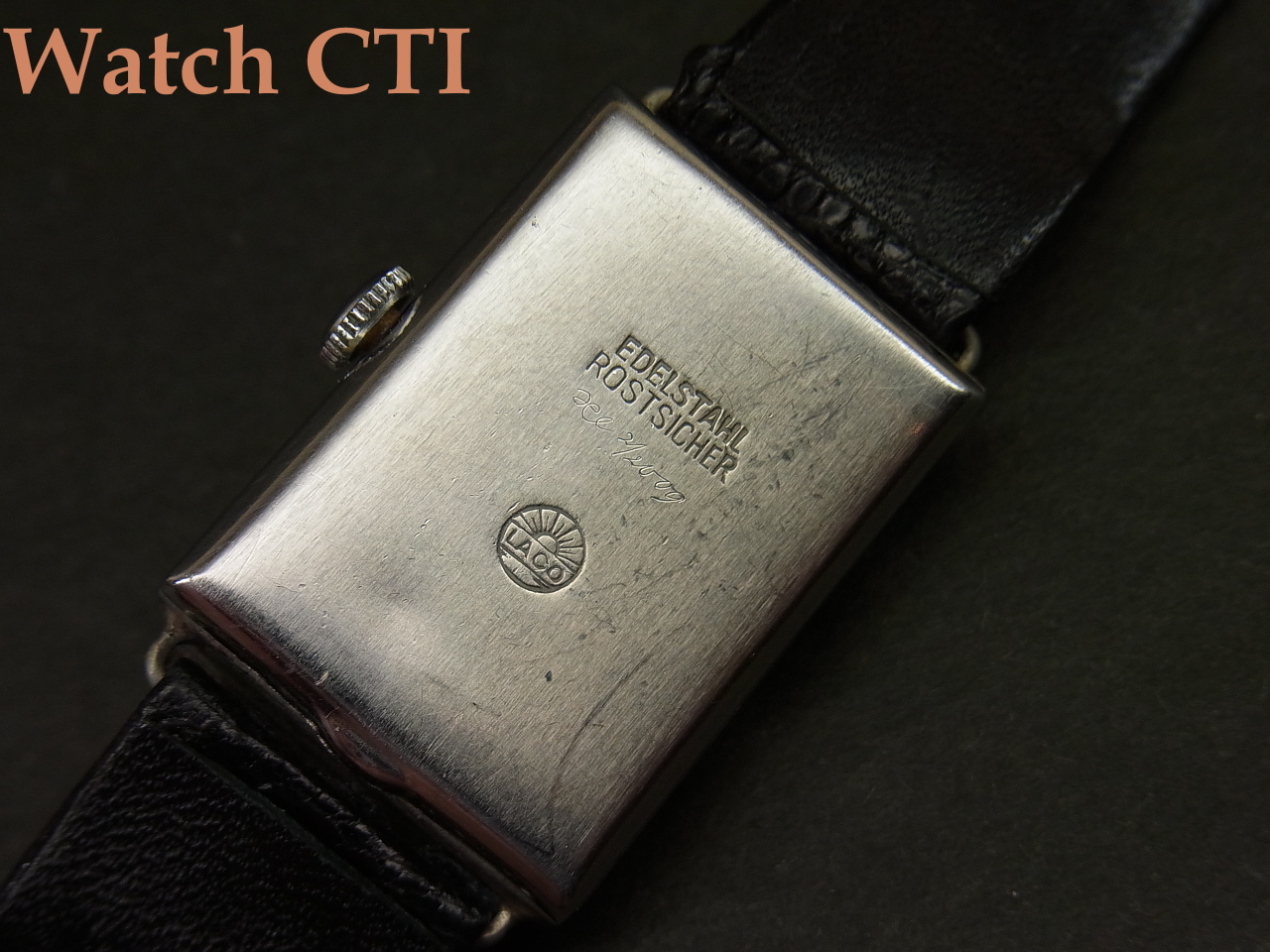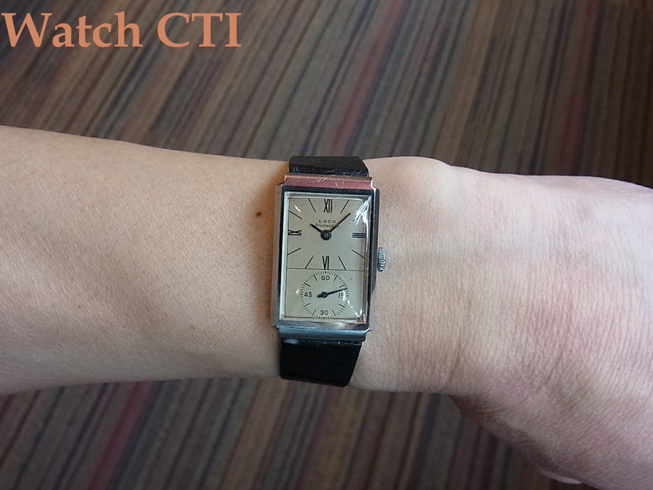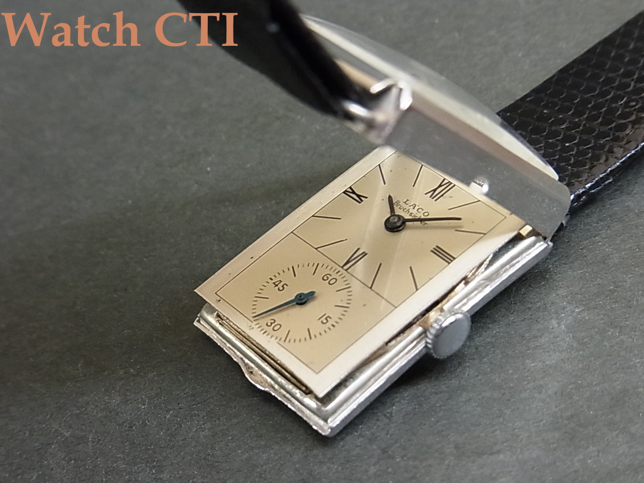 そこで…..ダイヤルをよく見てみますと….LACO銘の直下にBruchsicherと後プリントされております….これドイツ語で「耐震」の意に当たるようです。推測ですが、このドクターズウオッチ、元々耐震無しのムーブが搭載された同様製品が製造され、次いで耐震付きモデルを追加したものではないでしょうか….元来の耐震無しムーブ搭載用に作ったダイヤルに後足しでプリントした物でしょう…ROLEXなんかでも同様な後入れプリントの品がありますよね!!