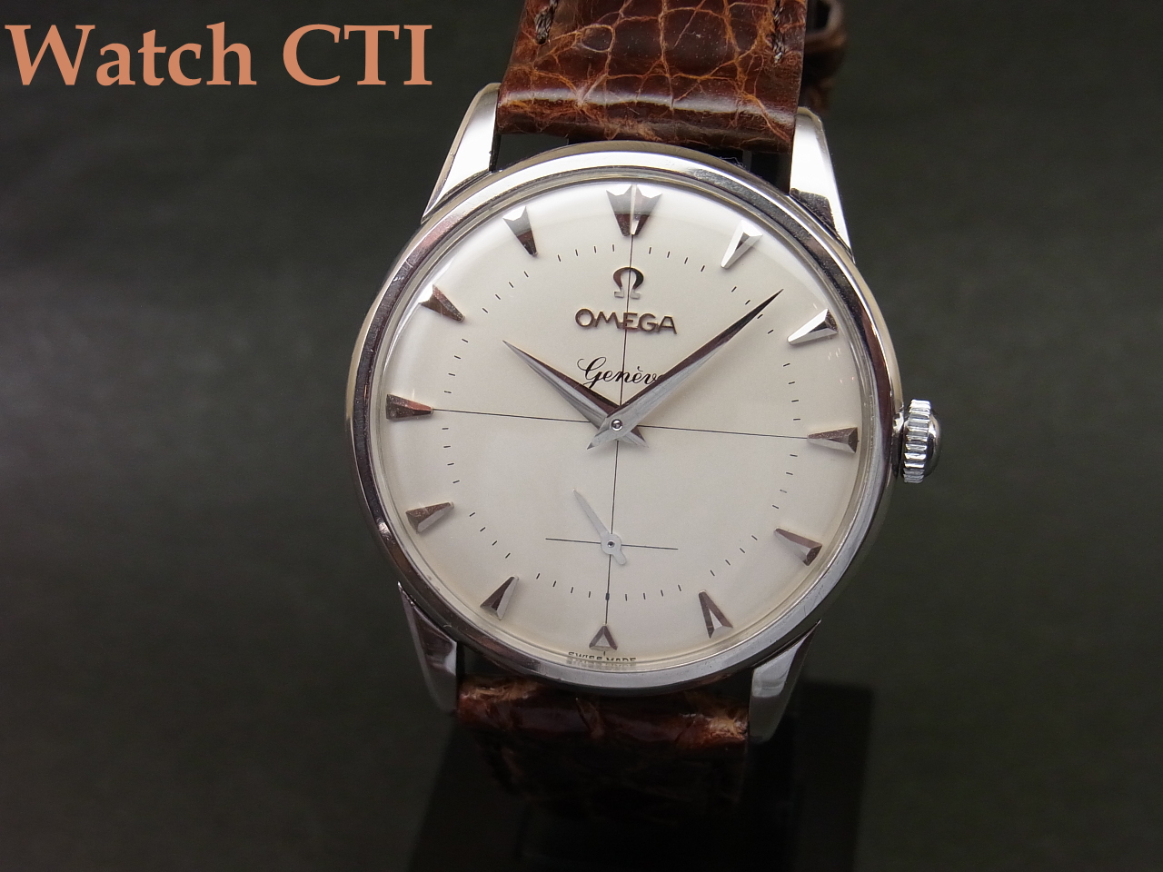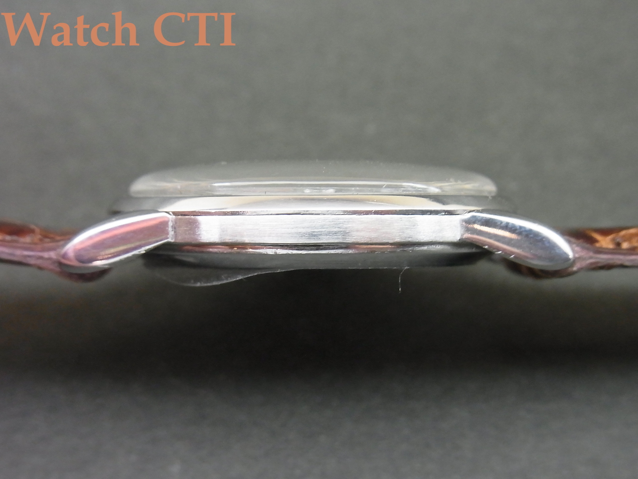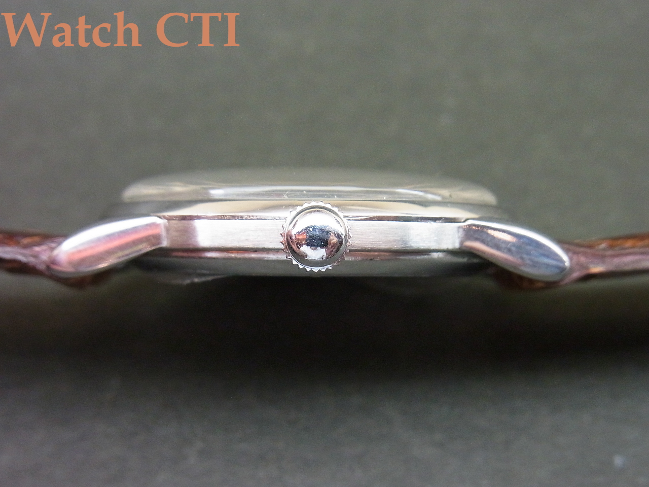 *外装はダイヤル含めて全体に非常に綺麗です。ケースはとても軽めなポリッシュが入っているように見えますが、特徴的なラグを含めて良くシェイプが残存していると言えるでしょう。リューズは後年の代用品ですが、シェイプ自体は当時装着されていた「デベソ」タイプでこちらもバランスを損なっておりません。後日、別途実費でオメガマーク入り別モデル用リューズに交換もできますが、今現在当店手持ちはございません。