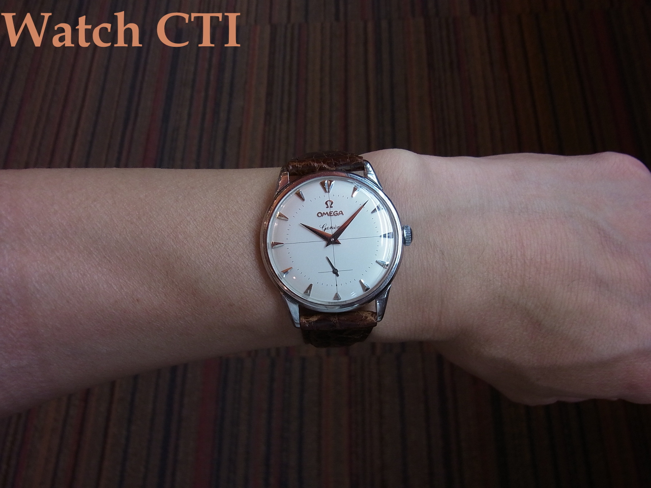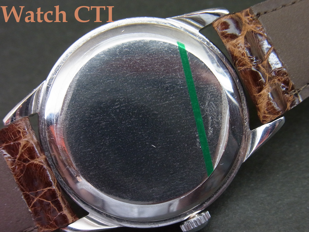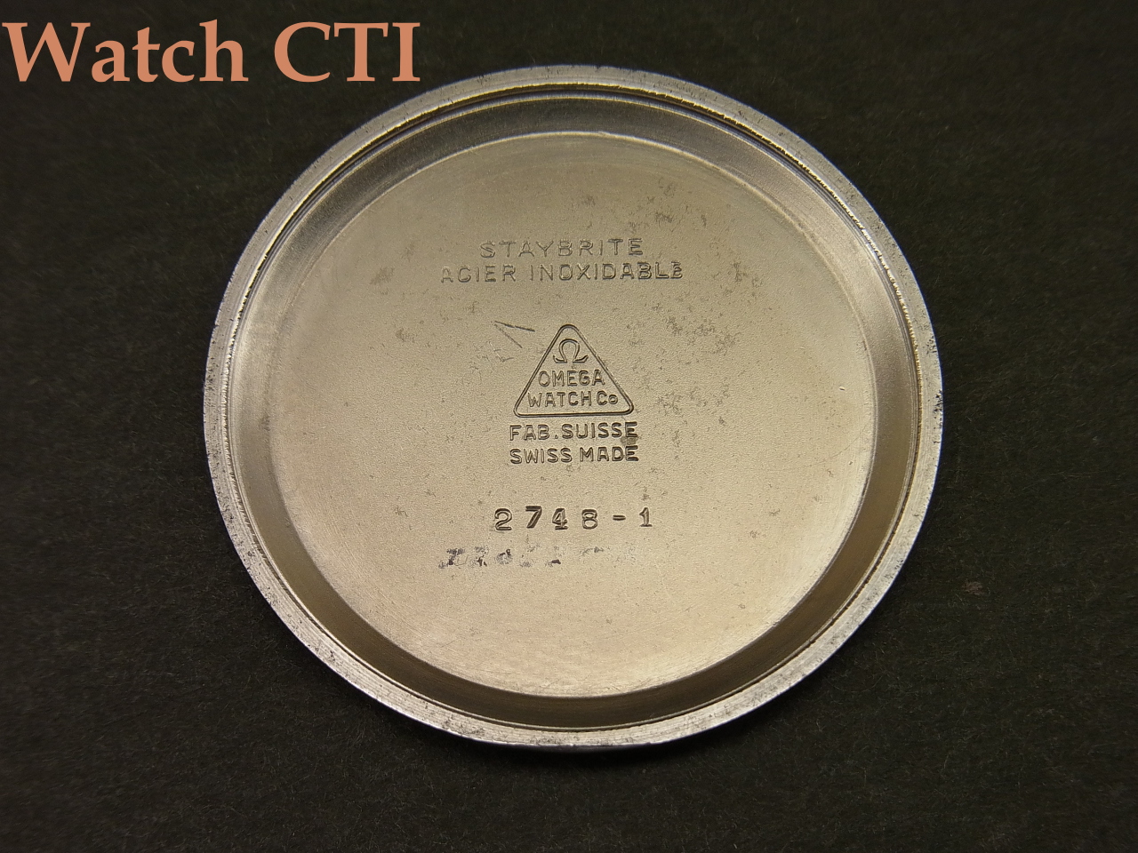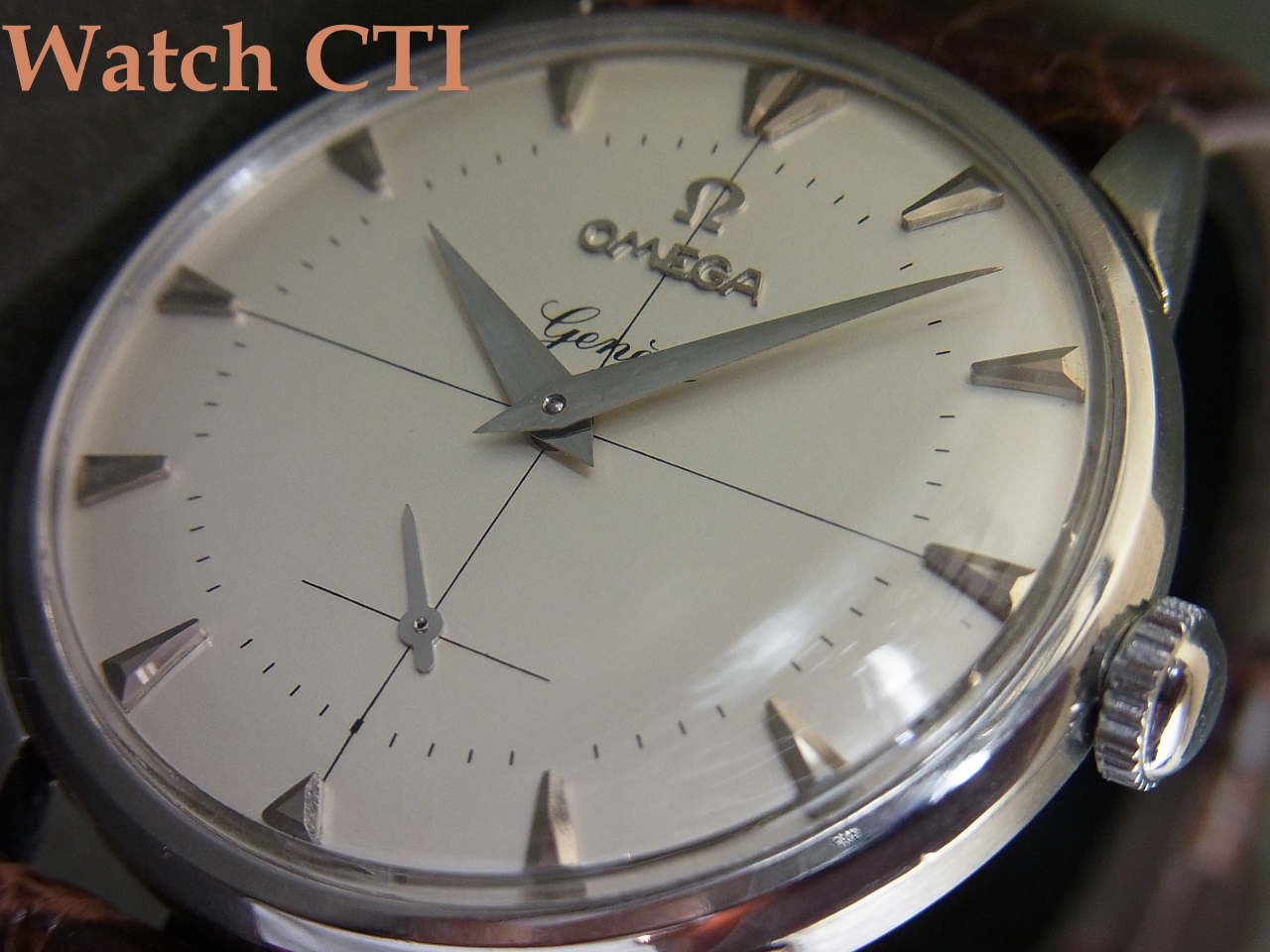 *外装はダイヤル含めて全体に非常に綺麗です。ケースはとても軽めなポリッシュが入っているように見えますが、特徴的なラグを含めて良くシェイプが残存していると言えるでしょう。リューズは後年の代用品ですが、シェイプ自体は当時装着されていた「デベソ」タイプでこちらもバランスを損なっておりません。後日、別途実費でオメガマーク入り別モデル用リューズに交換もできますが、今現在当店手持ちはございません。