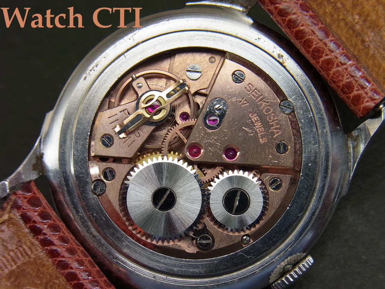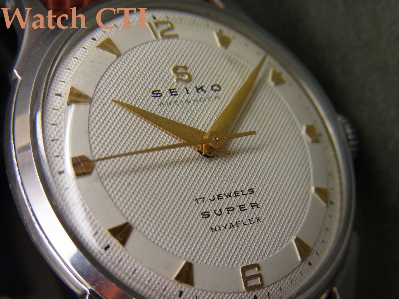 耐震装置自体はスイス製の輸入パーツで、「E-1型」と呼ばれていたタイプです。この後数年で目まぐるしく搭載する耐震装置が変わります。E-2>>R>>U>>S-1>>S-2となり、S型はセイコー自前のものでついに「ダイヤショック」の銘がそこで使われます。現品に搭載のE-1やE-2は文字板に明示のとおり「ANTISHOCK」アンチショックと表示するにとどまったものでした。