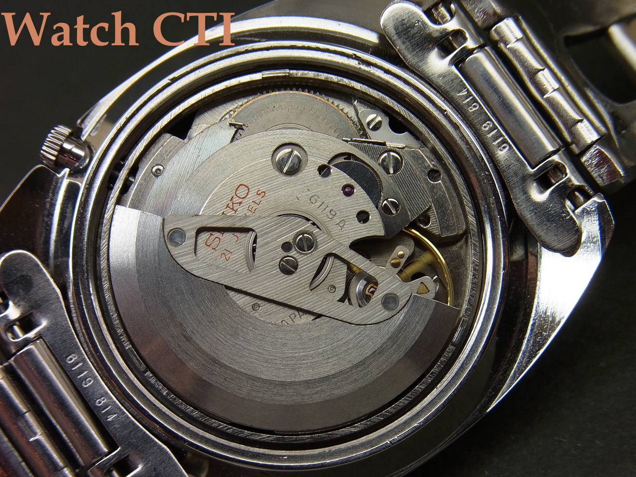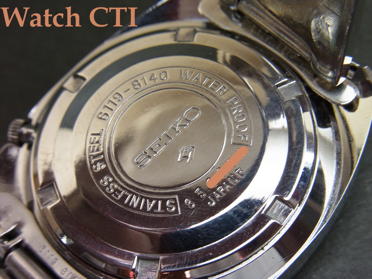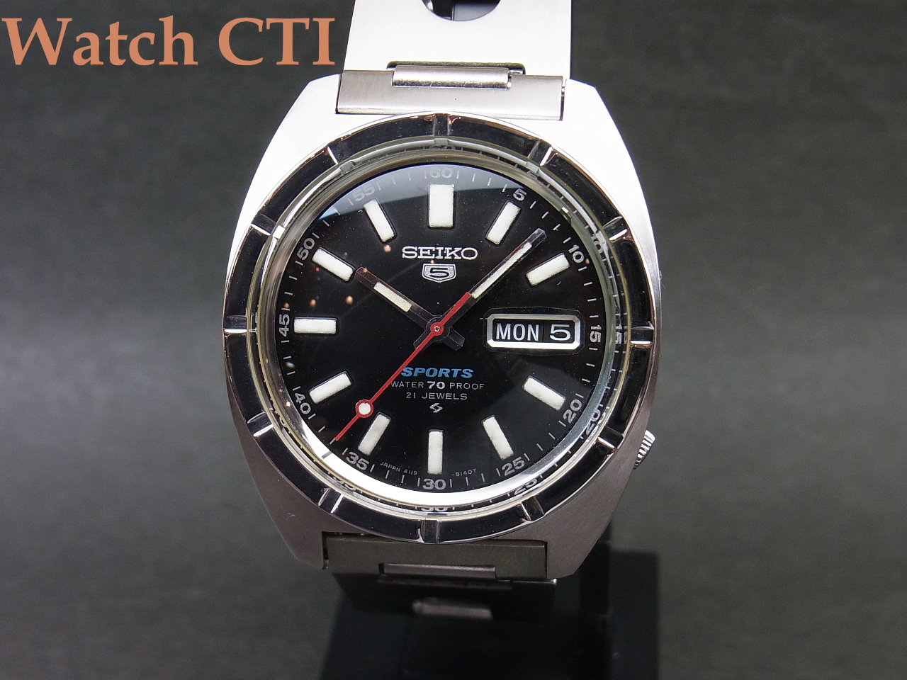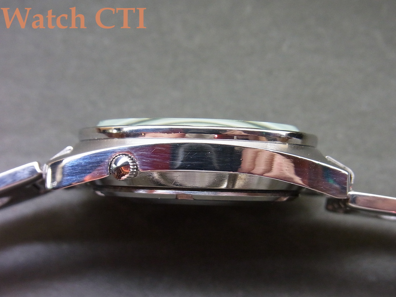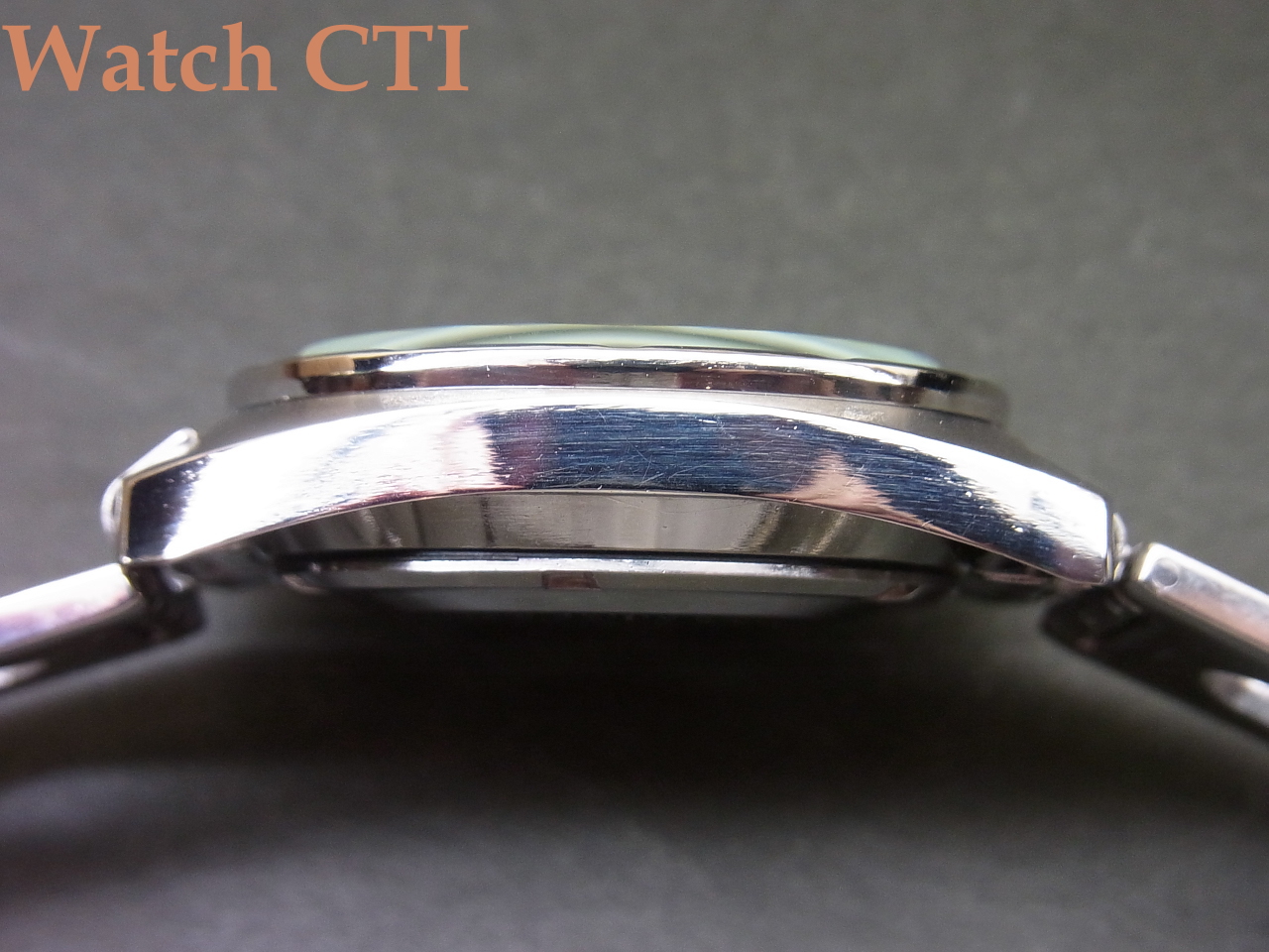 精悍でスポーティーですね。全体に非常に状態が良くケースエッジの立ちなども切れているのですが、どうゆう訳かベゼルのみ(ケースバックも、かもです)磨きが入っています….おそらく、デッドストック品として保管されていた間にベゼルに傷なり取りずらい曇り等がでてしまったものを入手した方がメンテナンスの際に磨を入れたのでしょう……