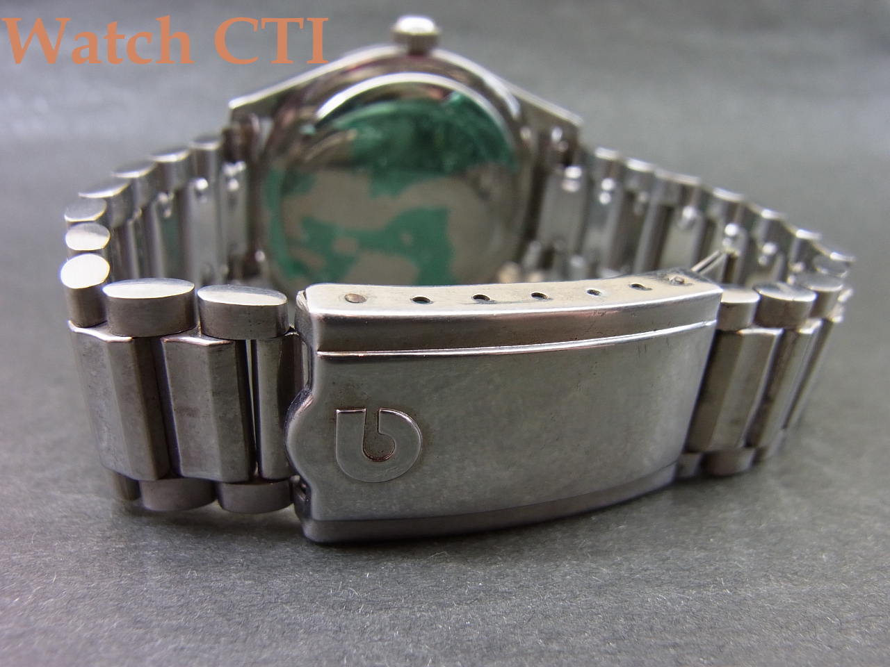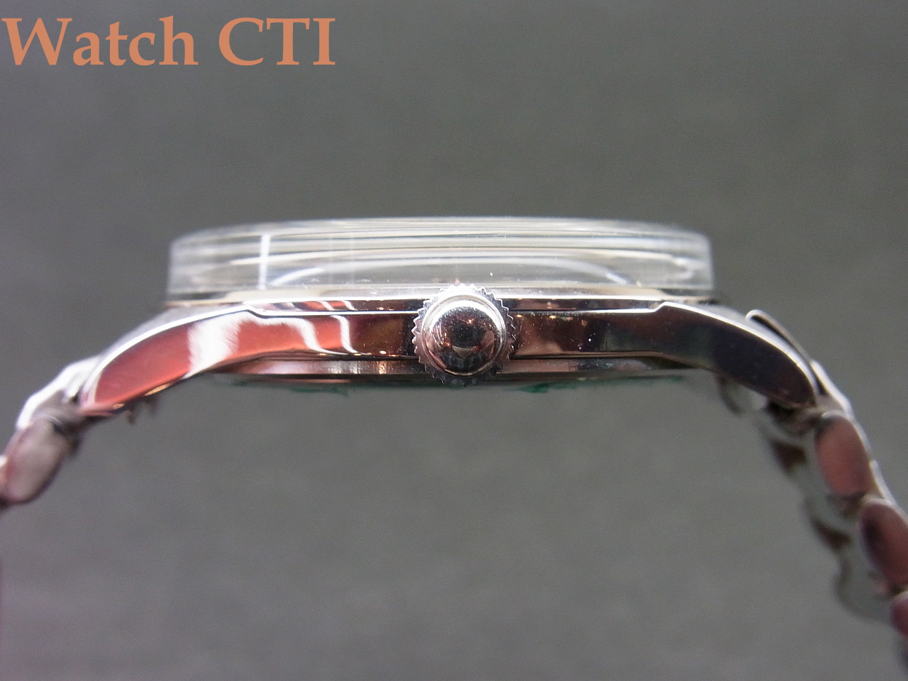 *全体に正に未使用で、相当永らくしまい込まれていものカト思います。機械の表面メッキや文字板インデックスメッキなどに久住が見られますが、長年ん保管期間中に少々の湿気の入り込みは合ったのでしょう。作動に問題はございません。