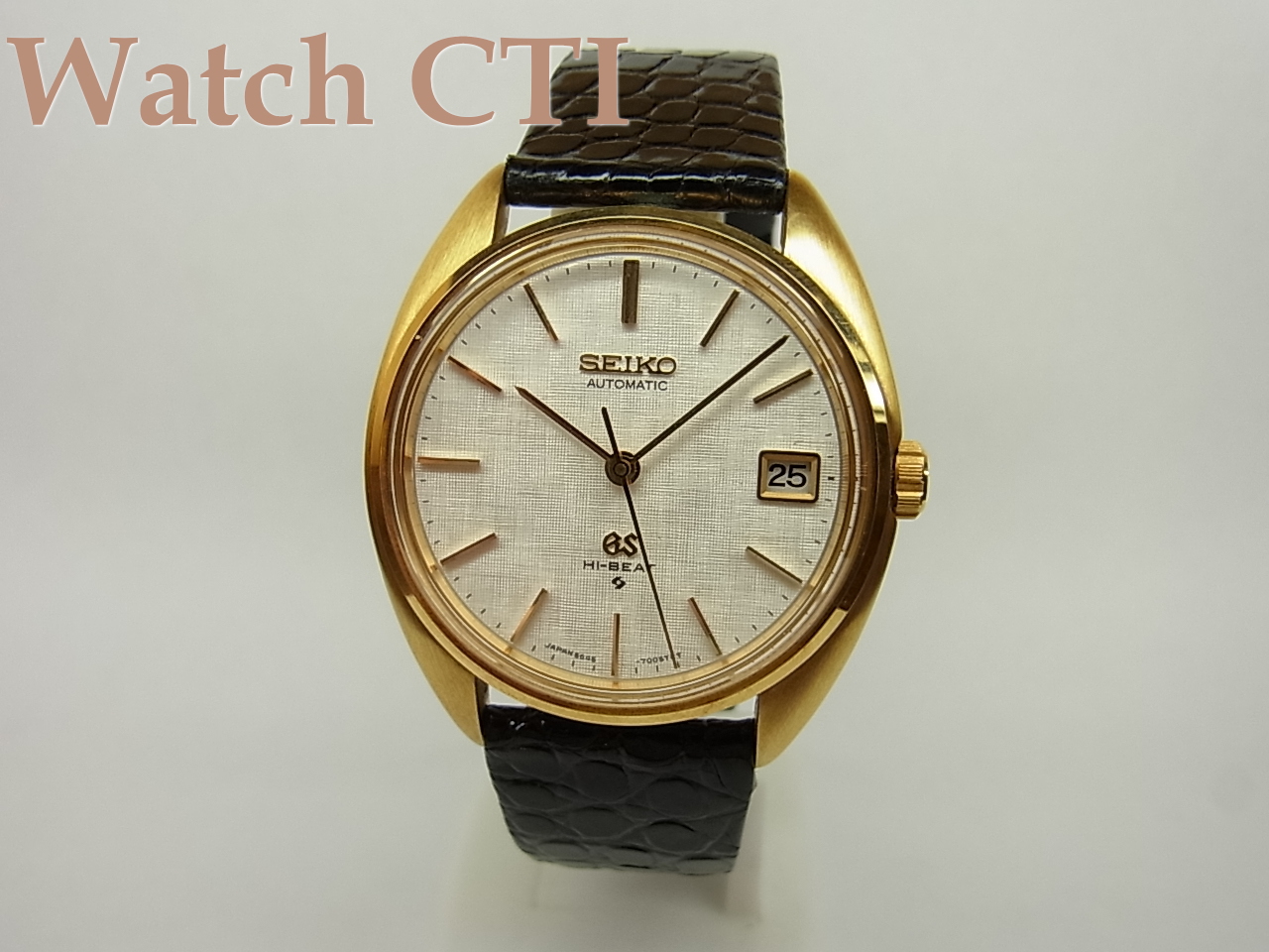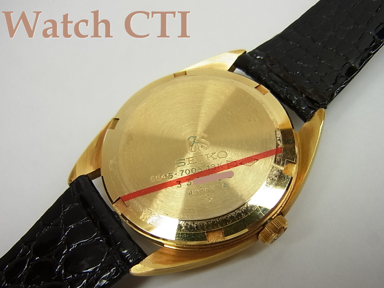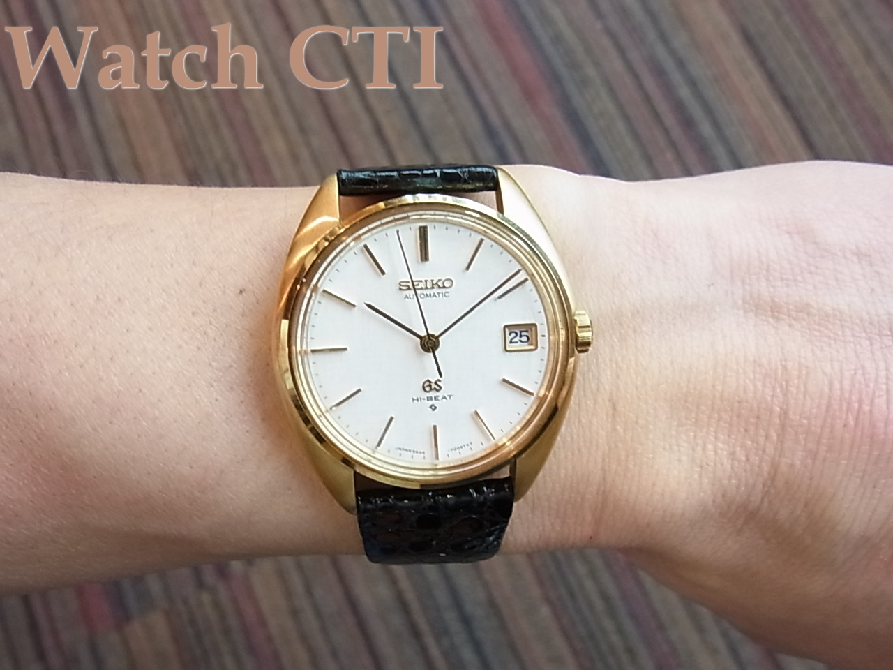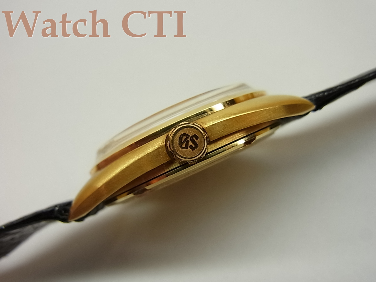 亀戸セイコー製5645-6005のRef.番号を持つこの型のケースは画像からもしっかり認識できる通りでミドルケースは全てやすり目のマット仕上げになっておりベゼルのポリッシュ仕上げとのコントラストが秀逸なモデルです。大概のUSED品はこのミドルケースのやすり目仕上げがシャツのカフ等との「擦れ」により磨滅してしまい、僅かにやすり目の跡が見受けられる程度になっているか、全くのポリッシュ仕上げのようにつるつるに光っていたりしており、現品のようなきれいなオリジナル状態を残すものは極めて希少です。その他の個所も素晴らしい状態で、リューズは使いこまれた磨滅は全くなく円周部分の角もGSの文字も全てがシャープなたたずまいです。ベぜル・ケースバックも全て素晴らしい!!!ラグ内側のベルト装着時についてしまうバネ棒が引っ掻いたスクラッチ傷が1-2mmほど見受けられるのが唯一のマイナス点でしょうか…….付属の18金無垢バックルはSEIKO銘ですが、これで純正です。(GS銘のムクバックルも同時にありました)純正の化粧箱も付属しております!