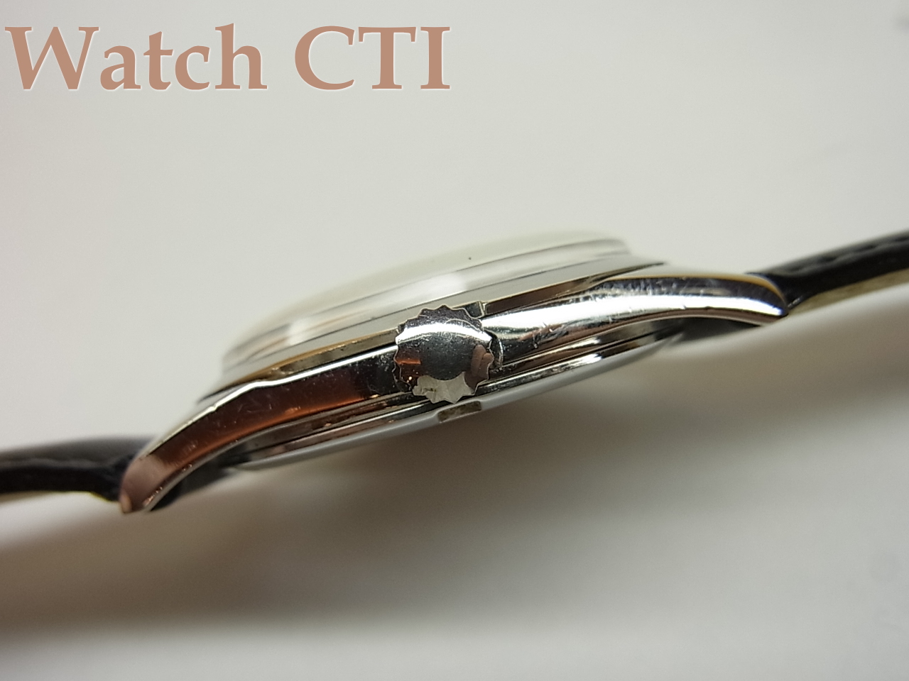 現品のスクリューバックケースはシリアルナンバーが入らない型の為正確な製造年は不明ですが、搭載される17石ホーマーが中期型である点から1961年以降の製造かと推測できます。精悍な黒文字板と生活防水のスクリューバックケースで実用上の使い勝手は抜群な一本となっております。